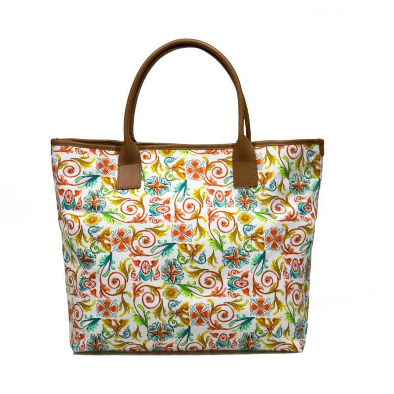 Borsa donna ammia, BAG FUNNY SCARAMANZIA, collezione funny, in canvas e manico e rifiniture in pelle con decori scaramantici tipici della tradizione siciliana. La shopping bag Funny è un formato ideale per la donna metropolitana.