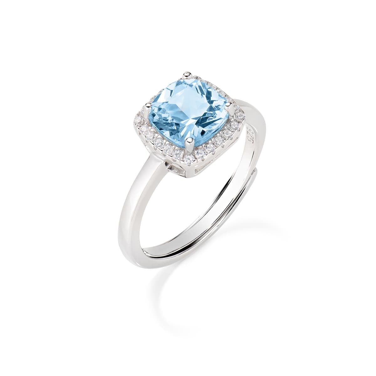 Anello donna amen, RQUABBACZ3, collezione diamonds, in argento 925 rodiato con zircone acquamarina centrale taglio radiant da 7 x 7 mm contornato da piccoli zirconi bianchi, misura dalla 16 alla 20