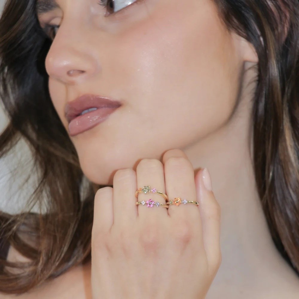 Anello donna amen, ANFIMGOL2, collezione primula, in argento 925 dorato con tre fiorellini di zirconi multicolor. Il fiore centrale a cinque petali è verde oliva, accompagnato da un bocciolo a quattro petali fucsia e uno arancione, misura regolabile dalla 10 alla 14