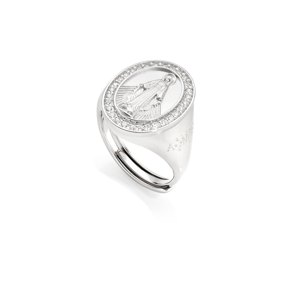 Anello donna amen, RMIBBZ3, collezione sacro, in argento 925 rodiato con zirconi bianchi raffigurante la Madonna Miracolosa. misura regolabile dalla 18 alla 22.