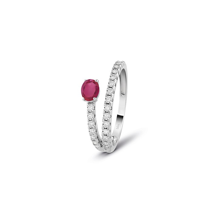 Anello donna bliss, 20095636, collezione rugiada colors, in oro bianco 18kt con diamanti 0.10ct colore gh e rubino 0.35ct