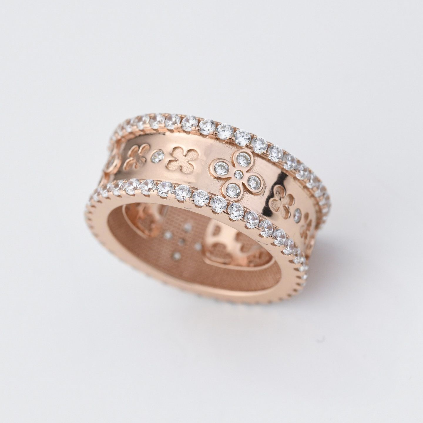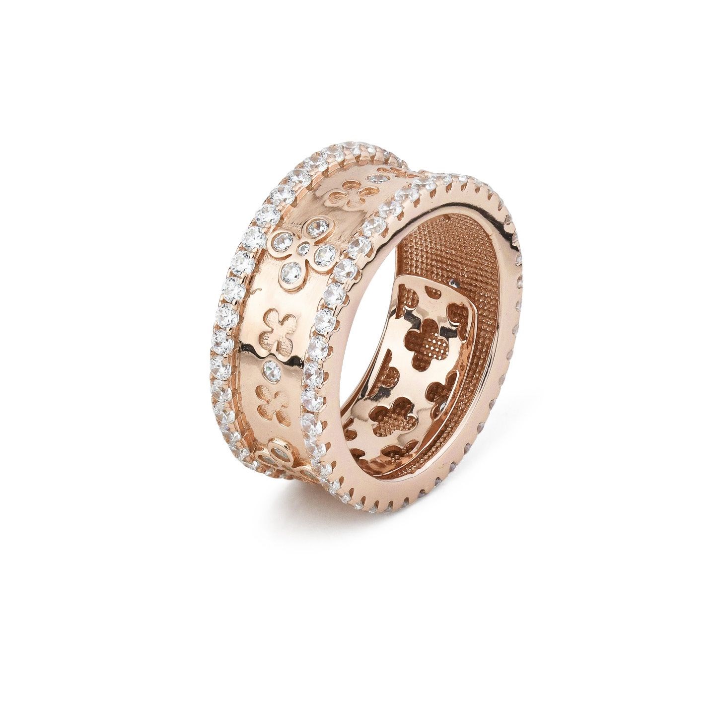 Anello donna boccadamo, XAN211RG, collezione nexma, in bronzo placcato oro rosa con motivo floreale inciso e ripetuto lungo tutta la fascia con doppio giro di zirconi. Misura: disponibili dalla 16 alla 19, regolatore interno Dimensione: spessore cm 1