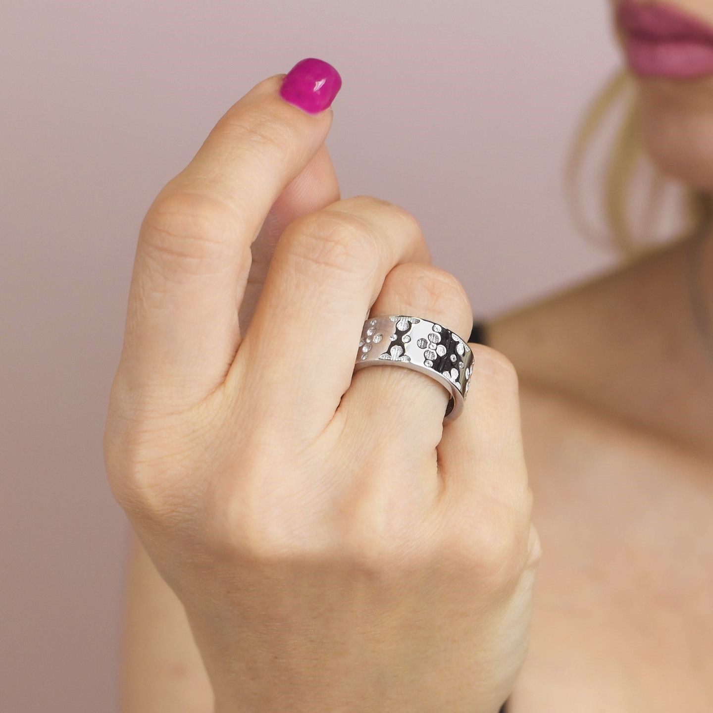 Anello donna boccadamo, XAN210G, collezione nexma, in bronzo rodiato grande con motivo floreale inciso e ripetuto lungo tutta la fascia con inserti di zirconi, misura disponibili dalla 16 alla 19, regolatore interno, spessore 1cm