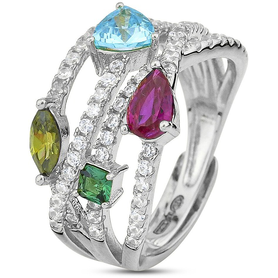 Anello donna boccadamo, AN512, collezione sophie, i in argento rodiato a fascia larga con con quattro file intrecciate di zirconi bianchi e zirconi di colore tanzanite, viola, rosa e verde, misura regolabile dalla 13 alla 17