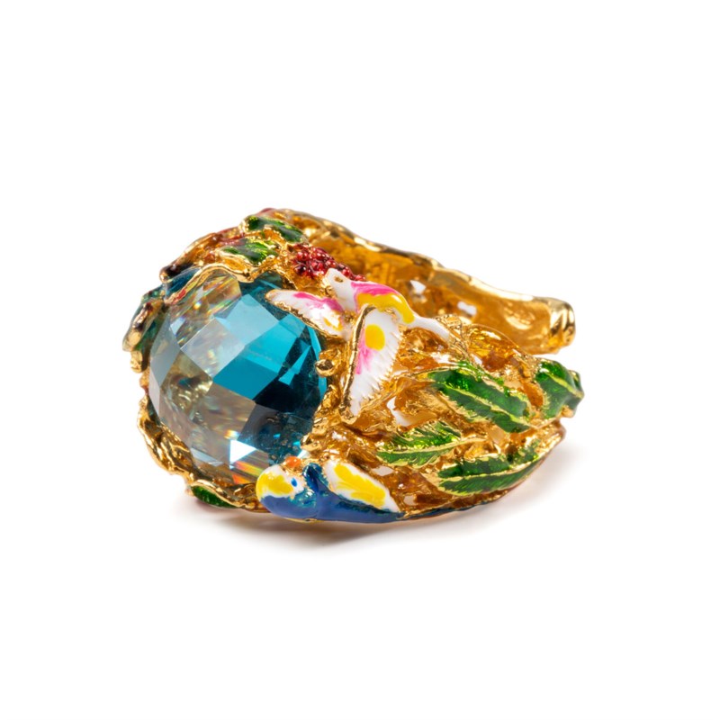 Anello donna isola bella, 20000357, collezione anelli, in argento 925 dorato con pietra azzurra e smalto. Foglie e rami in cui sbocciano fiori colorati e si poggiano farfalle e piccoli volatili: l’Aria è leggerezza, movimento, autonomia della mente e libero fluire dei pensieri.