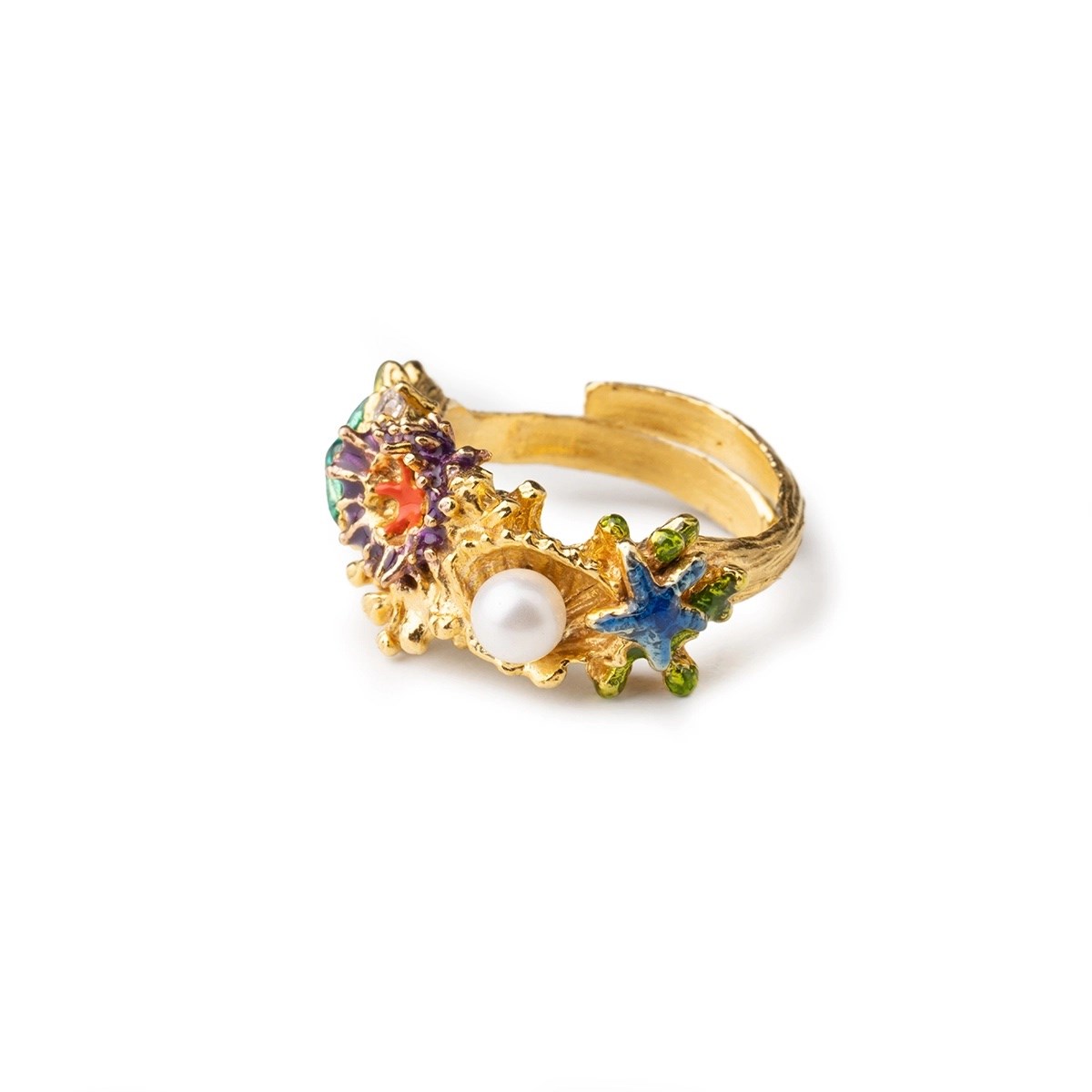 Anello donna isola bella, 20001482, collezione fondale, in argento 925 placcato oro, smalti, cubic zirconia e perle Lunghezza 2.3 cm Larghezza 1 cm Misura regolabile