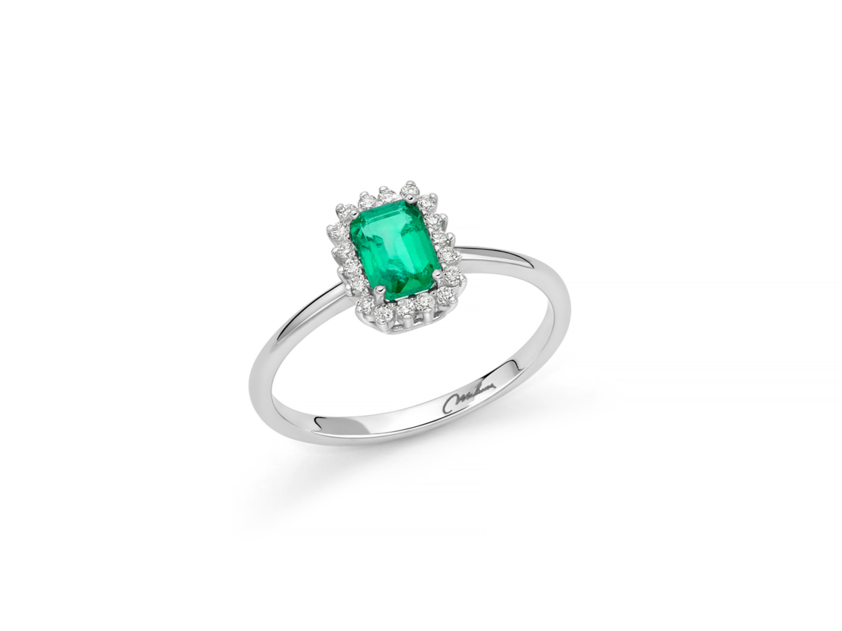 Anello donna miluna, LID3675, collezione gemme preziose Oro 750/1000 Nr 18 Diamanti naturali Pt.tot 12, 96 Col.G Pur.SI Taglio Brillante Rotondo Nr 1 Smeraldi naturali Ottagonale mm 6x4 Ct 0, 55