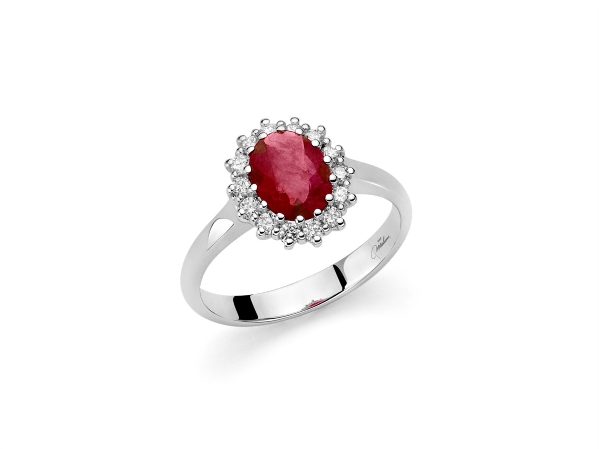 Anello donna miluna, LID3393, collezione premium gemme Oro 750/1000 Nr 14 Diamanti naturali Pt.tot 28 Col.G Pur.SI Taglio Brillante Rotondo Nr 1 Rubini naturali Ovale mm 8x6 Ct 1, 54