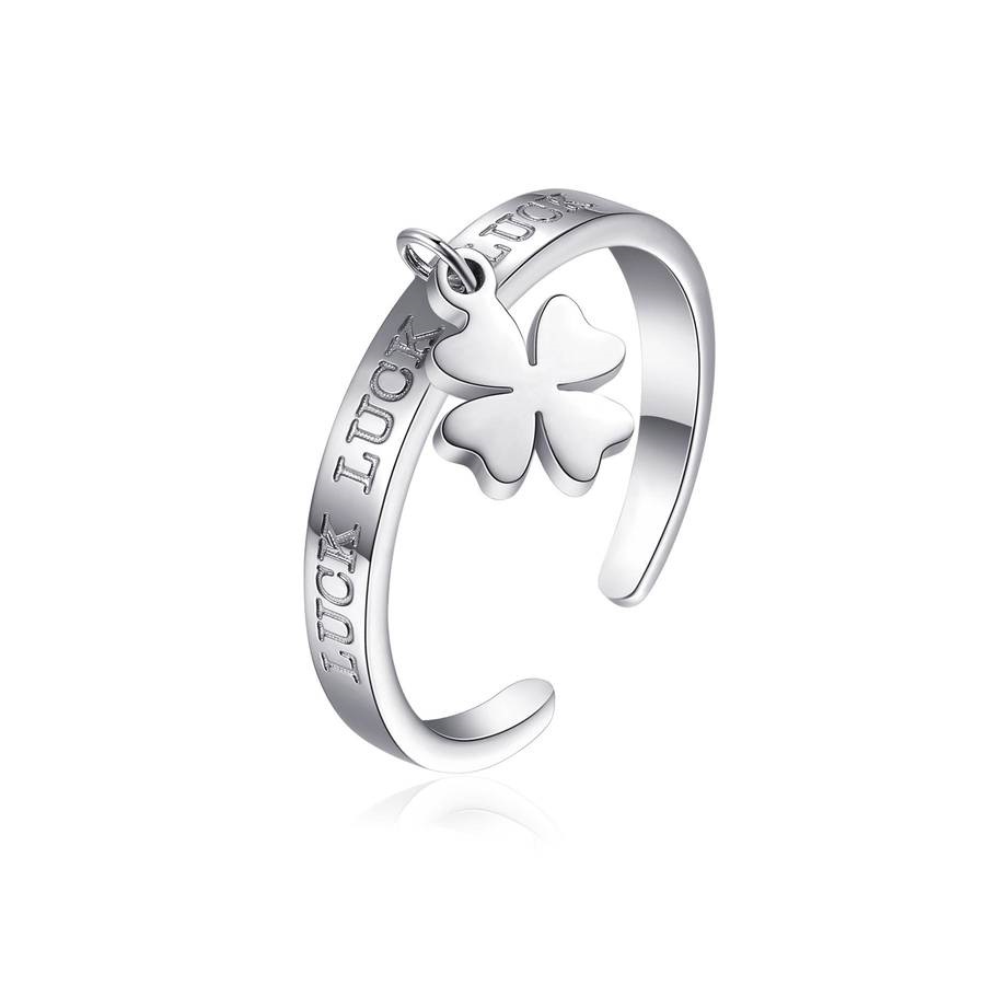 Anello donna s'agapò, Sck150, collezione click, in acciaio con pendente quadrifoglio e scritta 'lucky', misura regolabile