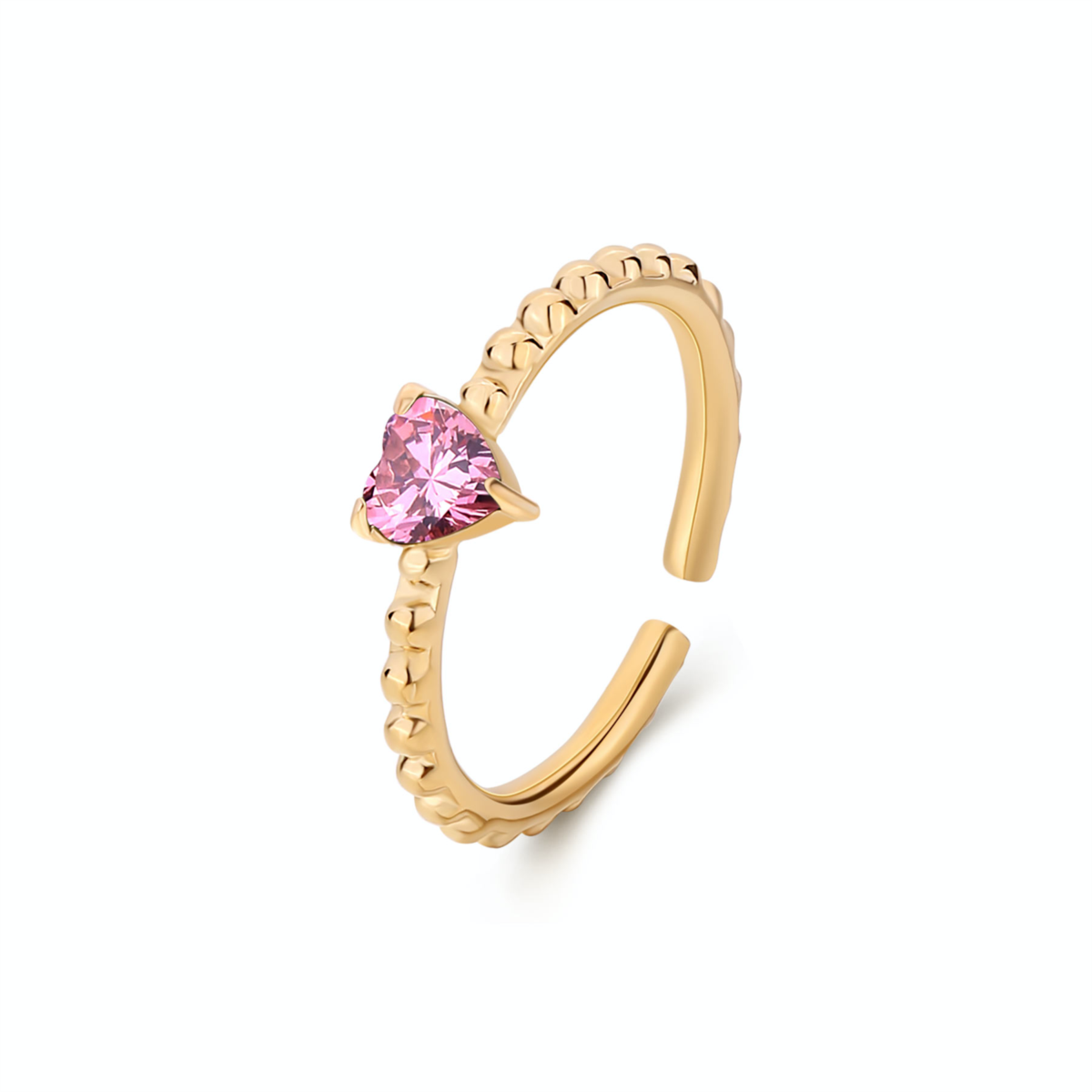 Anello donna sagapò, SDZ129, collezione dazzly, in acciaio 316L e finitura dorata con cubic zirconia rosa a forma di cuore. misura regolabile.