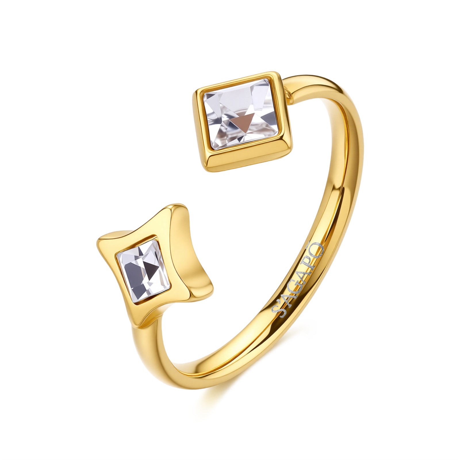 Anello donna sagapò, SCE62, collezione luce, in acciaio 316L e finitura dorata con cristalli.