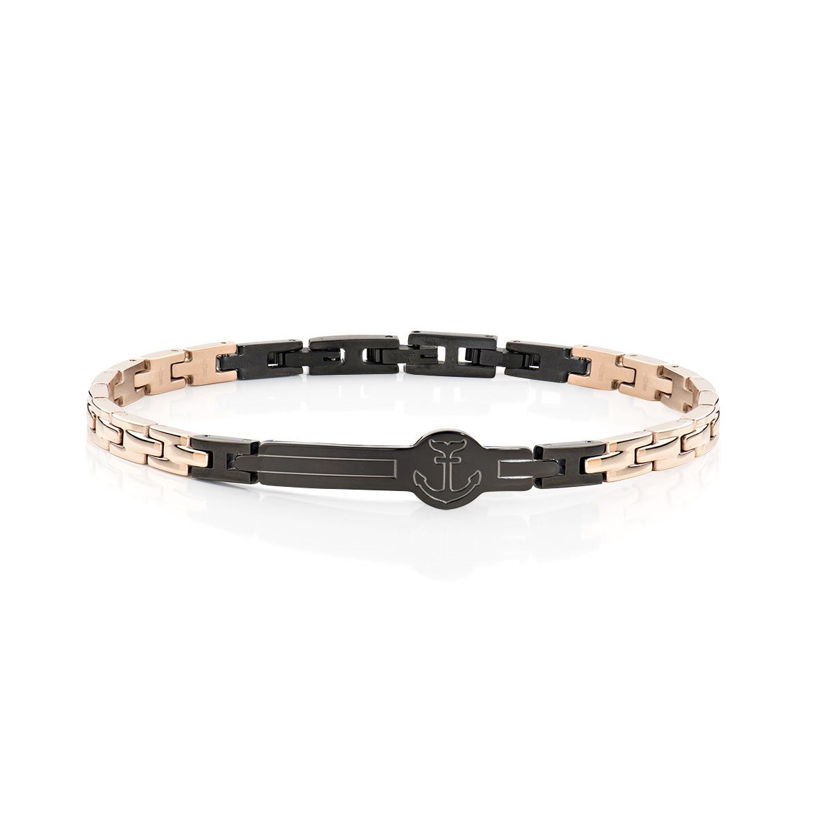 Bracciale uomo amen, ACBR052728RN, collezione metropolitan, in acciaio con catena semirigida, finitura rosata e nera, ed elemento centrale con ancora.