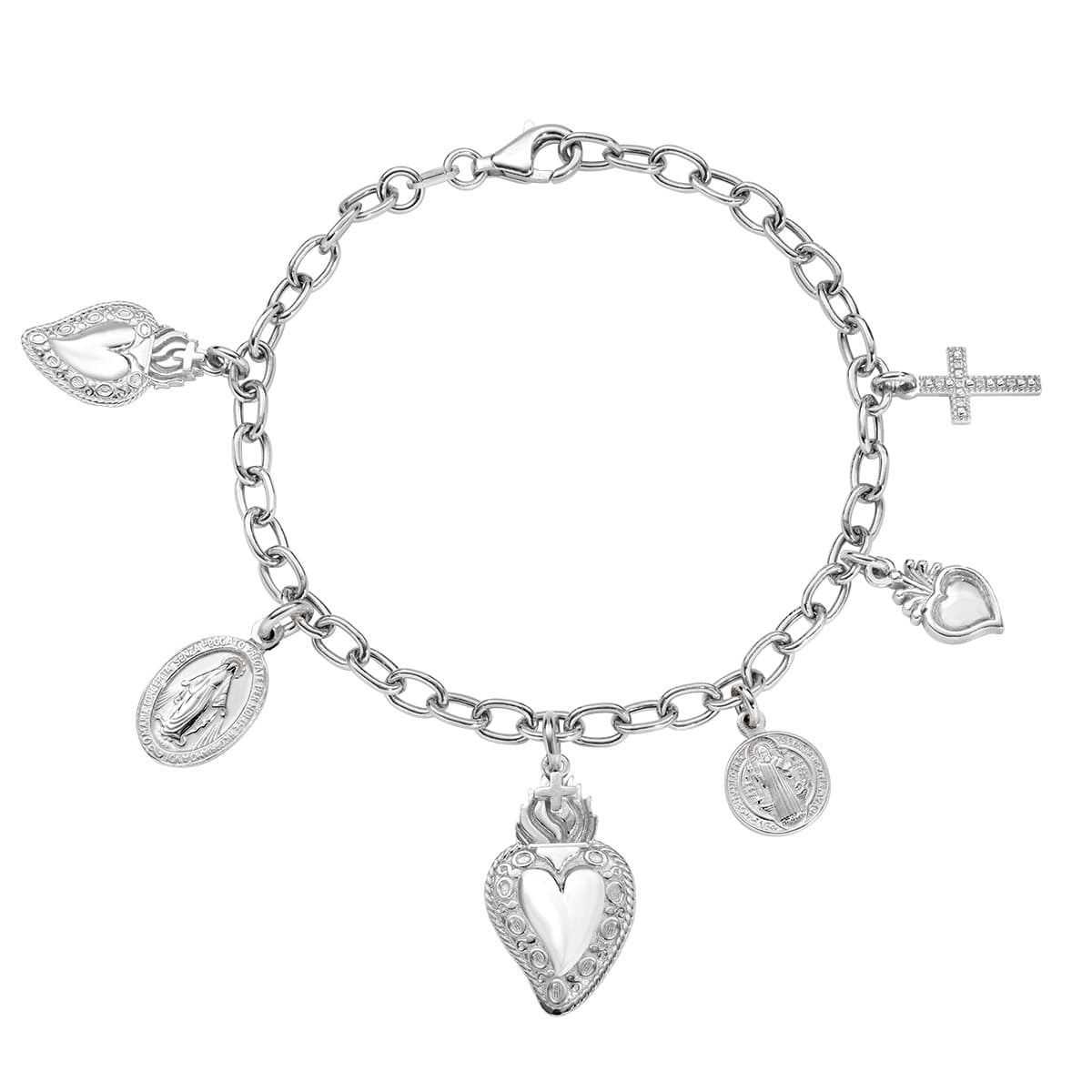 Bracciale donna amen, BRSCMB, collezione sacro, in argento 925 rodiato con sei pendenti: tre Sacro Cuore, una croce, una medaglietta con Madonna Miracolosa, una medaglia di San Benetto.