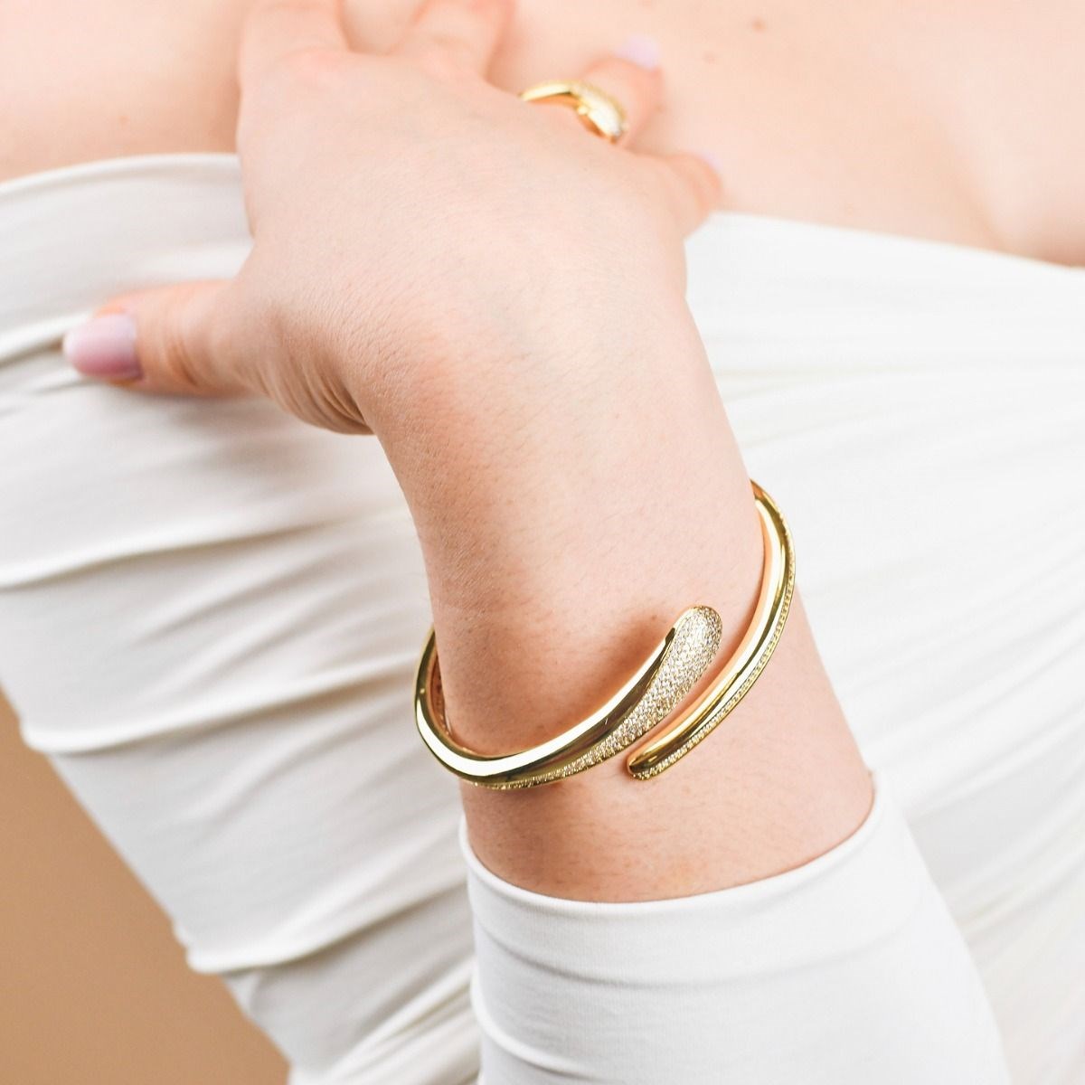 Bracciale donna boccadamo, KBR027D, collezione caleida, in bronzo placcato oro giallo con pavè di zirconi a forma di goccia. Misura: diametro interno cm 5, 5 Dimensione: goccia mm 6; totale centrale mm 15