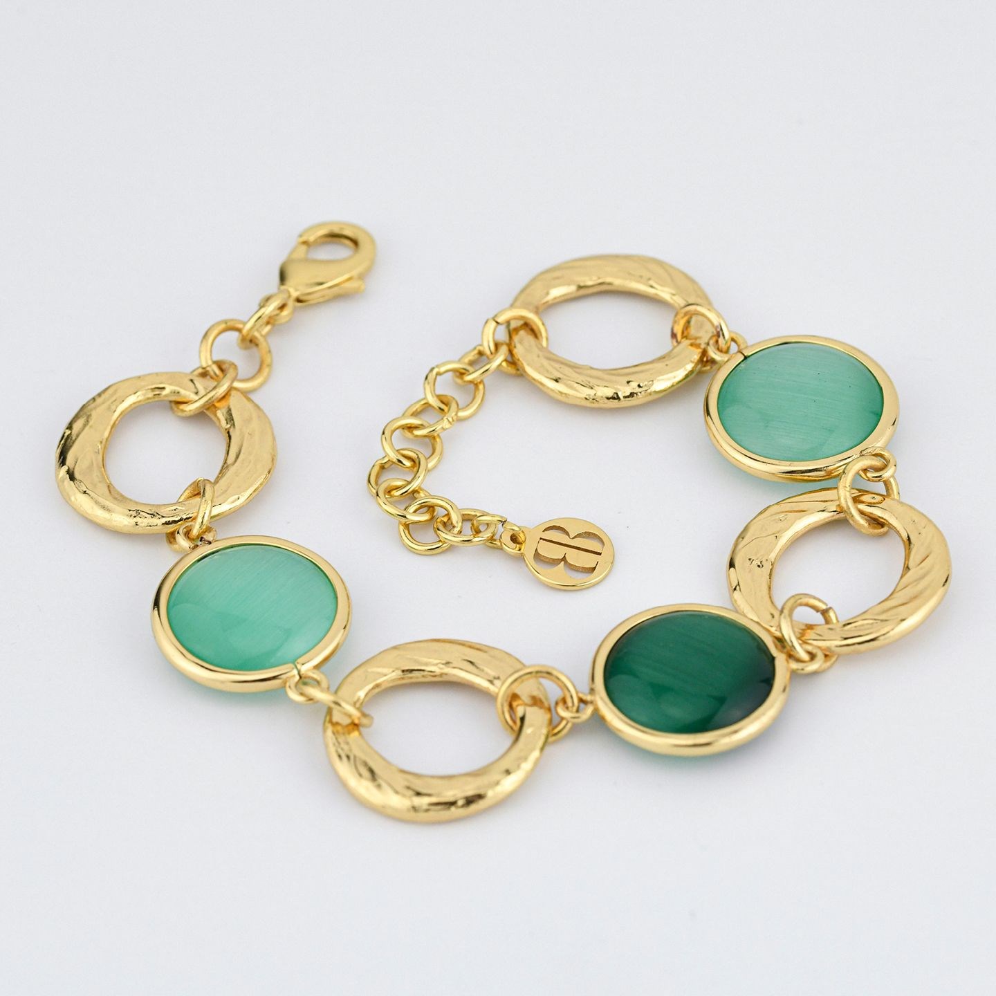 Bracciale donna boccadamo, XB1035DT, collezione crisette, in bronzo oro giallo con cristalli effetto cabochon di colore verde scuro e verde acqua tra moduli circolari martellati. Misura: lunghezza cm 16, 5 estendibile fino a cm 20 Dimensione: cristalli cm 1, 5