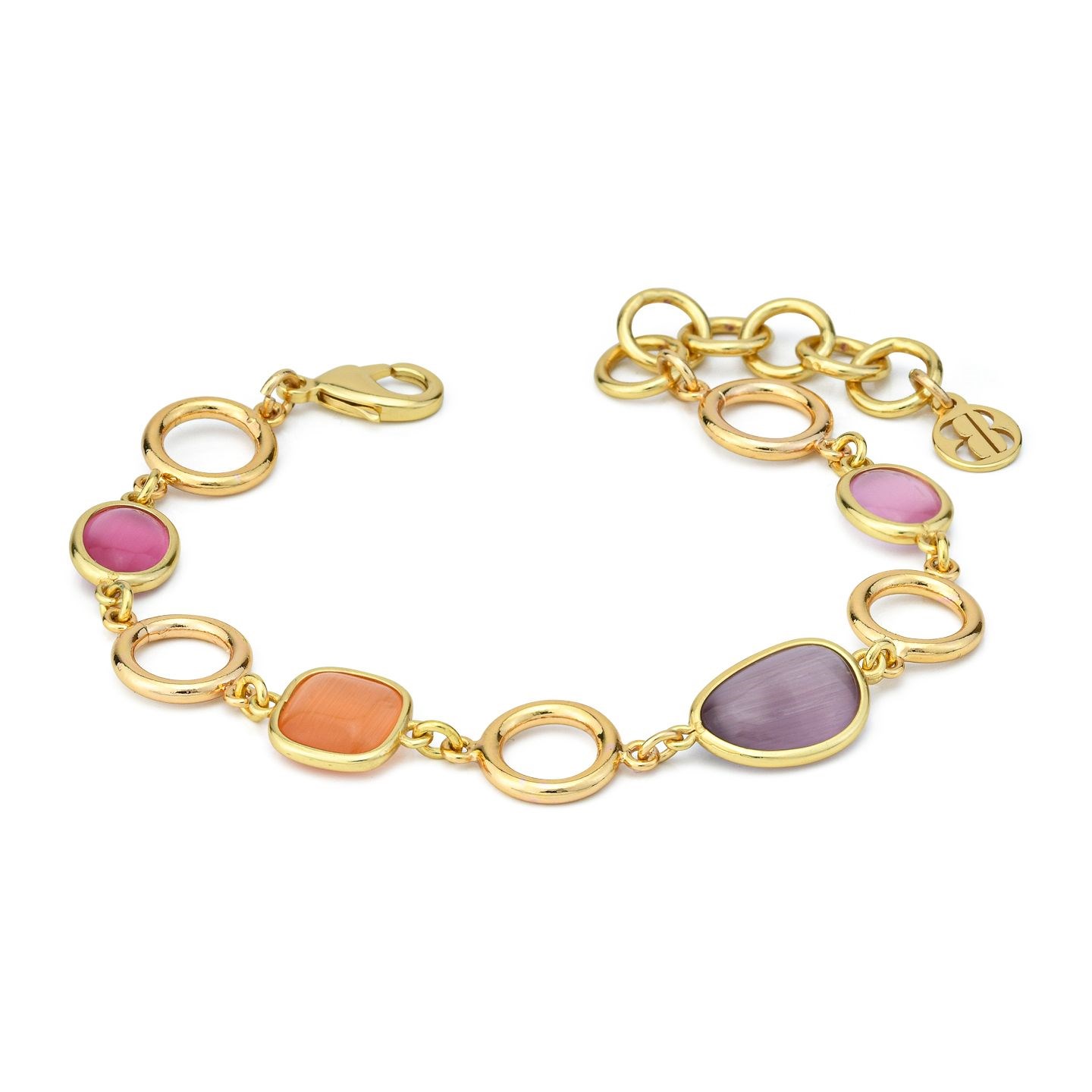 Bracciale donna boccadamo, XB1017DP, collezione crisette, in bronzo placcato oro giallo con cristallo centrale di colore purple e cristalli di colore rosa baby e orange alternati a moduli circolari Misura: lunghezza cm 16, estendibile fino a cm 19, 5 Dimensione: cristalli cm 1, 5; centrale cm 1x1, 5