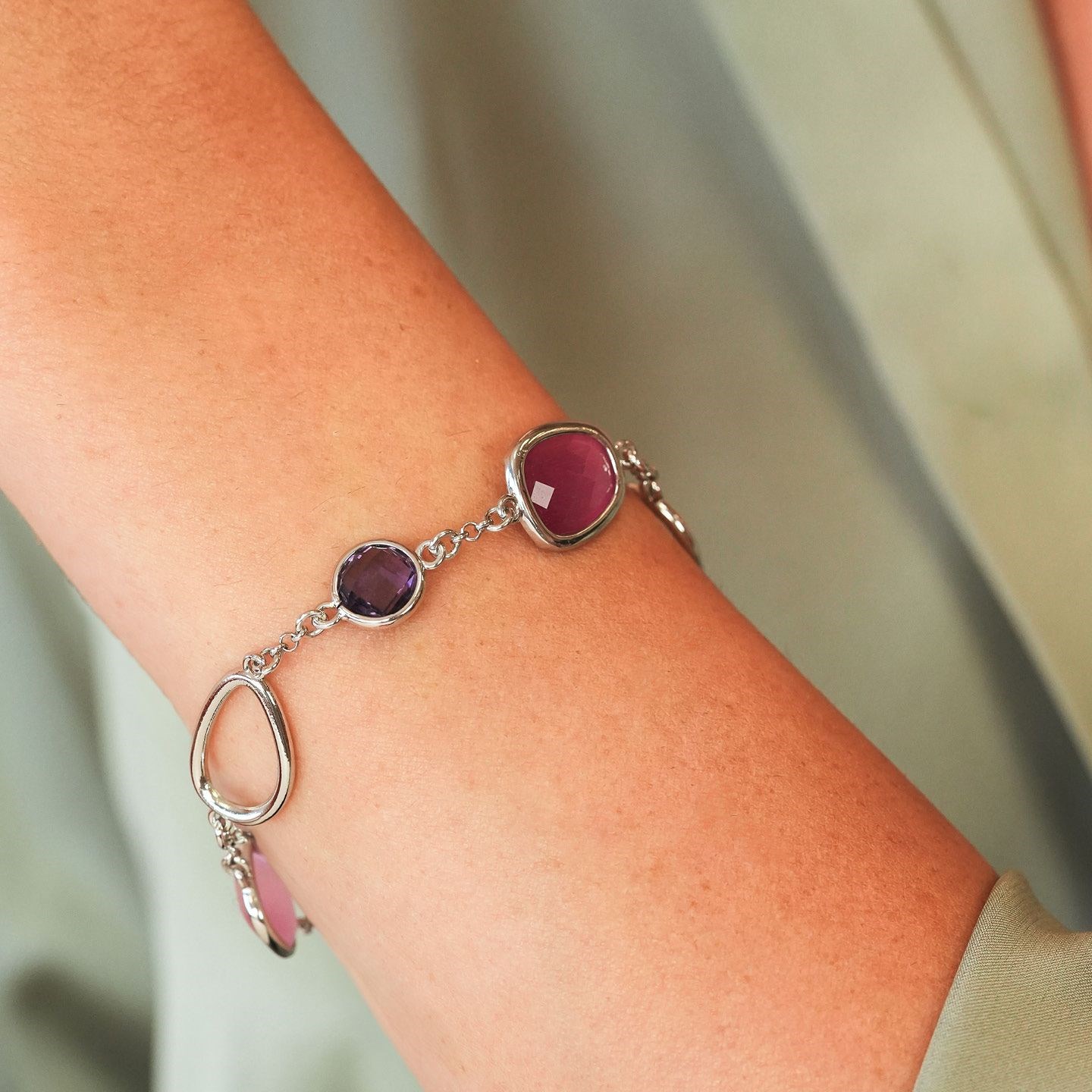 Bracciale donna boccadamo, XB1042, collezione crisette, in bronzo rodiato con cristallo centrale, effetto briolette e cabochon, di colore rosa shocking tra moduli quadrati di colore rosa e moduli circolari di colore ametista.