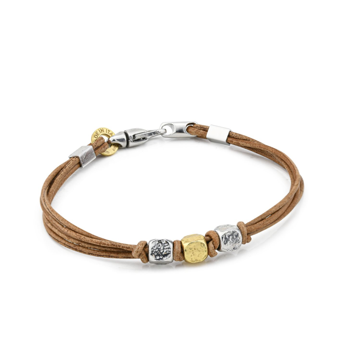 Bracciale uomo boccadamo, MBR219M, collezione man, in fili di cuoio intrecciato con chiusura in argento rodiato, cubotti martellati in argento rodiato e cubotto centrale placcato oro giallo, lunghezza 21cm
