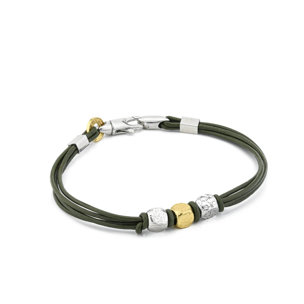 Bracciale uomo boccadamo, MBR219V, collezione man, in fili di cuoio intrecciato verde scuro con chiusura in argento rodiato, cubotti martellati in argento rodiato e cubotto centrale placcato oro giallo, lunghezza 21cm