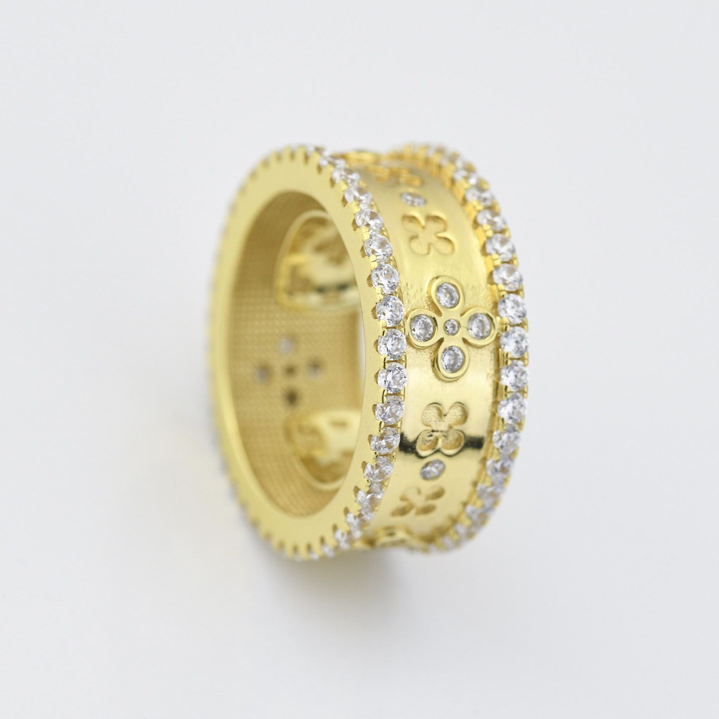Anello donna boccadamo, XAN211DP, collezione nexma, in bronzo placcato oro giallo con motivo floreale inciso e ripetuto lungo tutta la fascia con doppio giro di zirconi. Misura: disponibili dalla 12 alla 15, regolatore interno Dimensione: spessore cm 1
