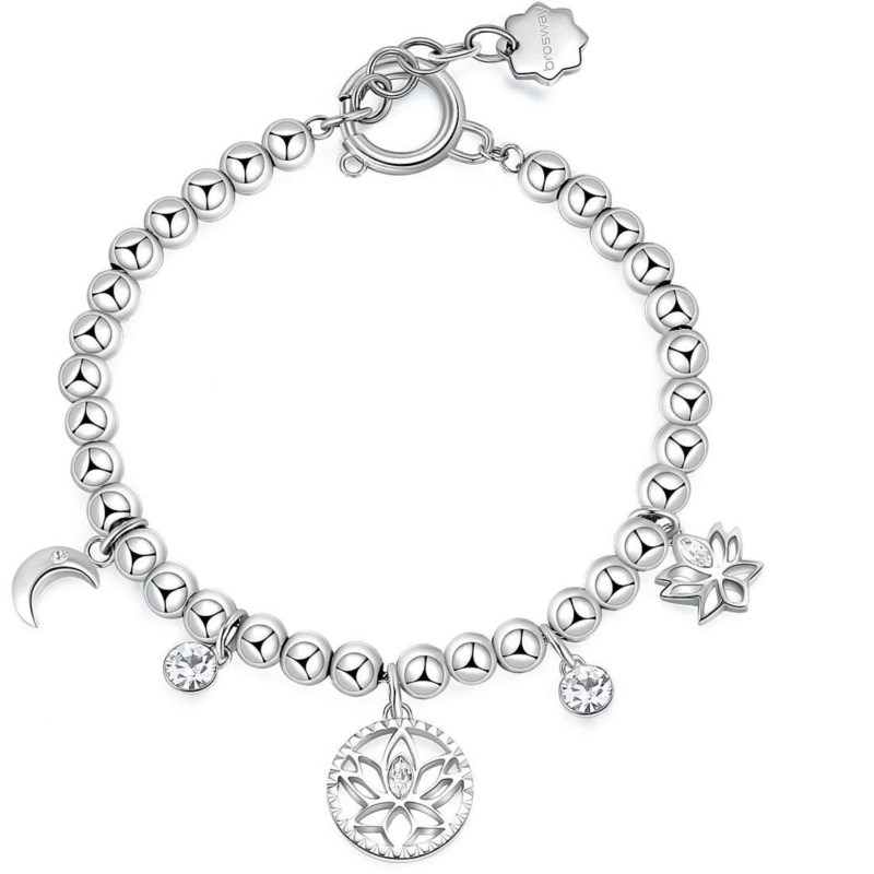 Bracciale donna brosway, Bhkb115, collezione chakra, in acciaio con pendenti Fiori Di Loto, Luna e cristalli, lunghezza 18, 5cm regolabile