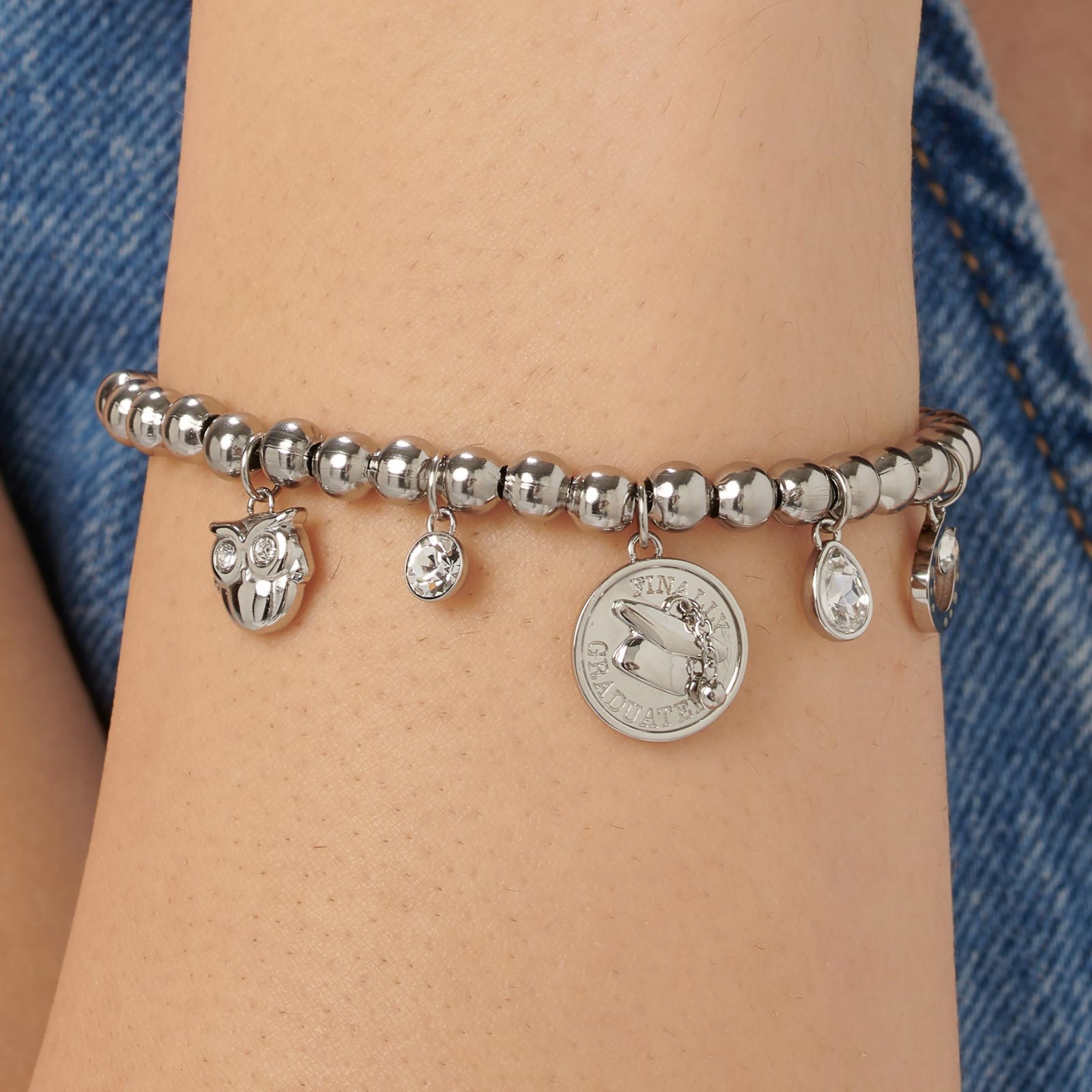 Bracciale donna brosway, BHKB205, collezione chakra, in acciaio 316L, pendente centrale con scritta "finally graduated", pendenti a forma di gufo, ferro di cavallo e cristalli, misura 18cm