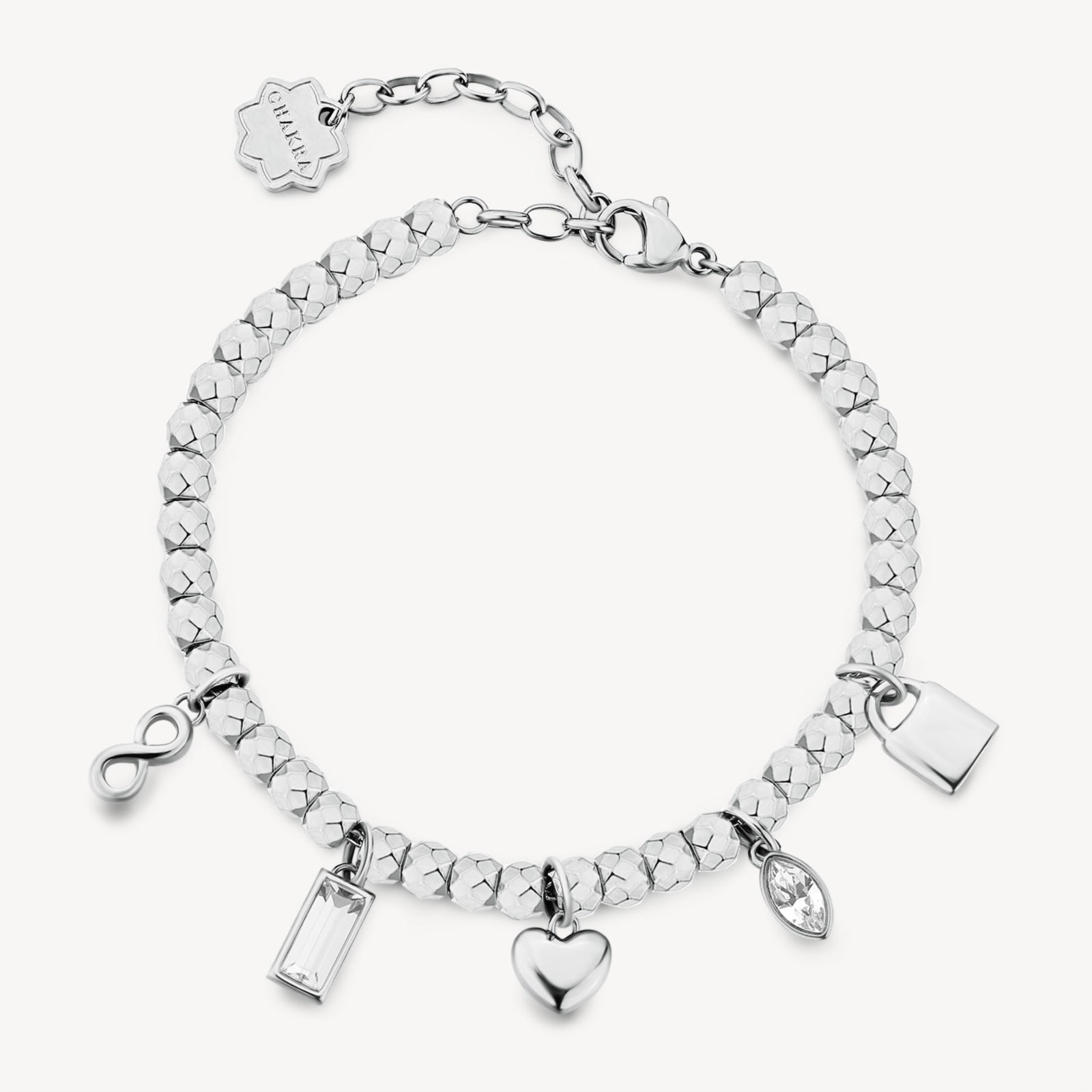 Bracciale donna brosway, BHKB249, collezione chakra, in acciaio 316L e pendenti con infinito, cuore, lucchetto e cristalli, misura 18cm