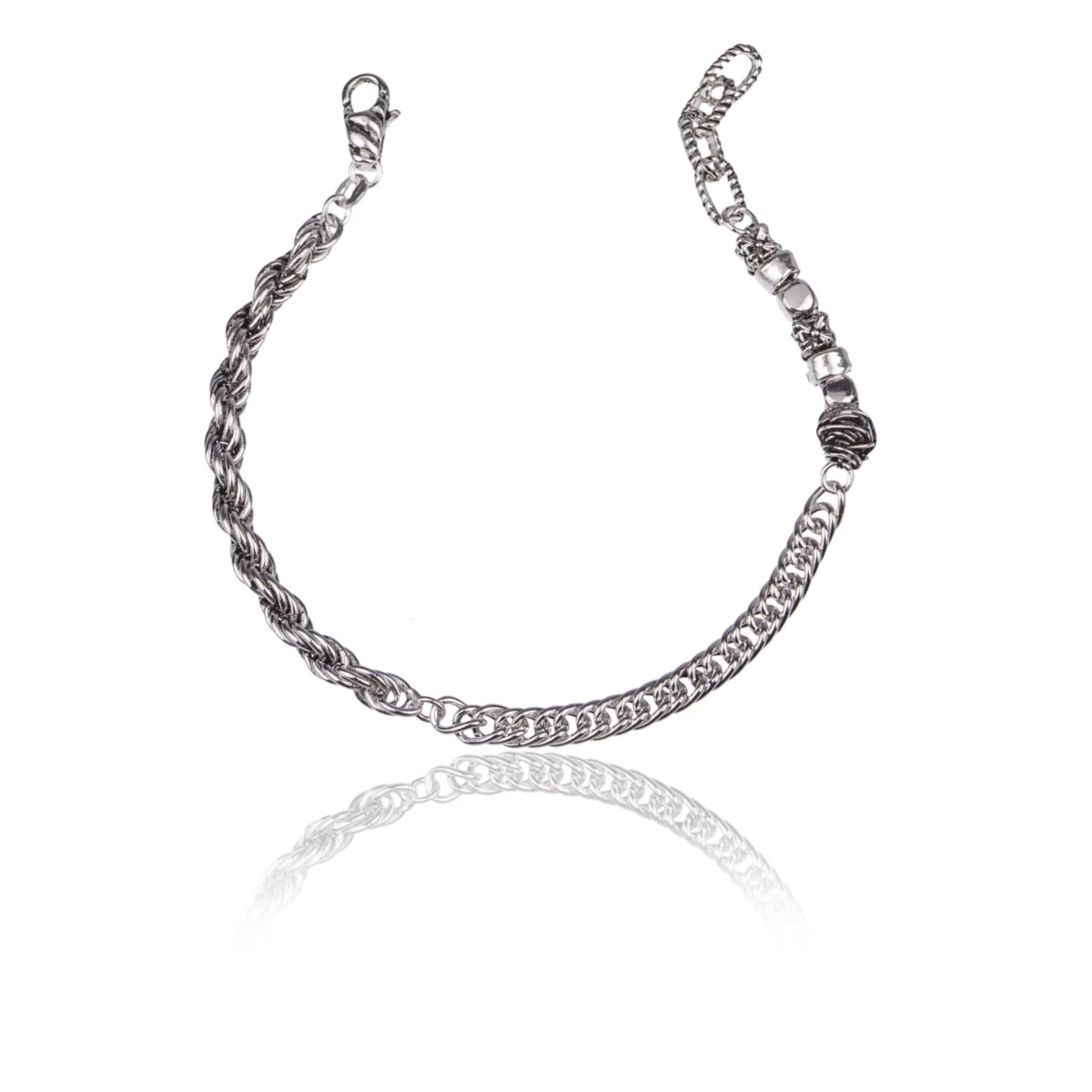 Bracciale uomo giacomo burroni, MBC 0034, collezione bracciale, in argento 925 Il corpo si sviluppa a sinistra su di una catena con maglie a corda. Centralmente è applicata una catena groumette a maglie strette. A destra invece si sviluppa un filo di pepite intervallate ad altri elementi artigianali. A dividere, un nodino di filigrana etrusca avvolta a mano
