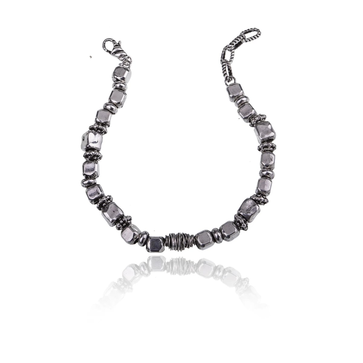 Bracciale uomo giacomo burroni, MBC 0017, collezione bracciale, in argento 925 Il bracciale si sviluppa su di un filo di pepite in argento intervallate da anellini granulati artigianalmente. Al centro è posizionato un gomito di filigrana etrusca avvolta