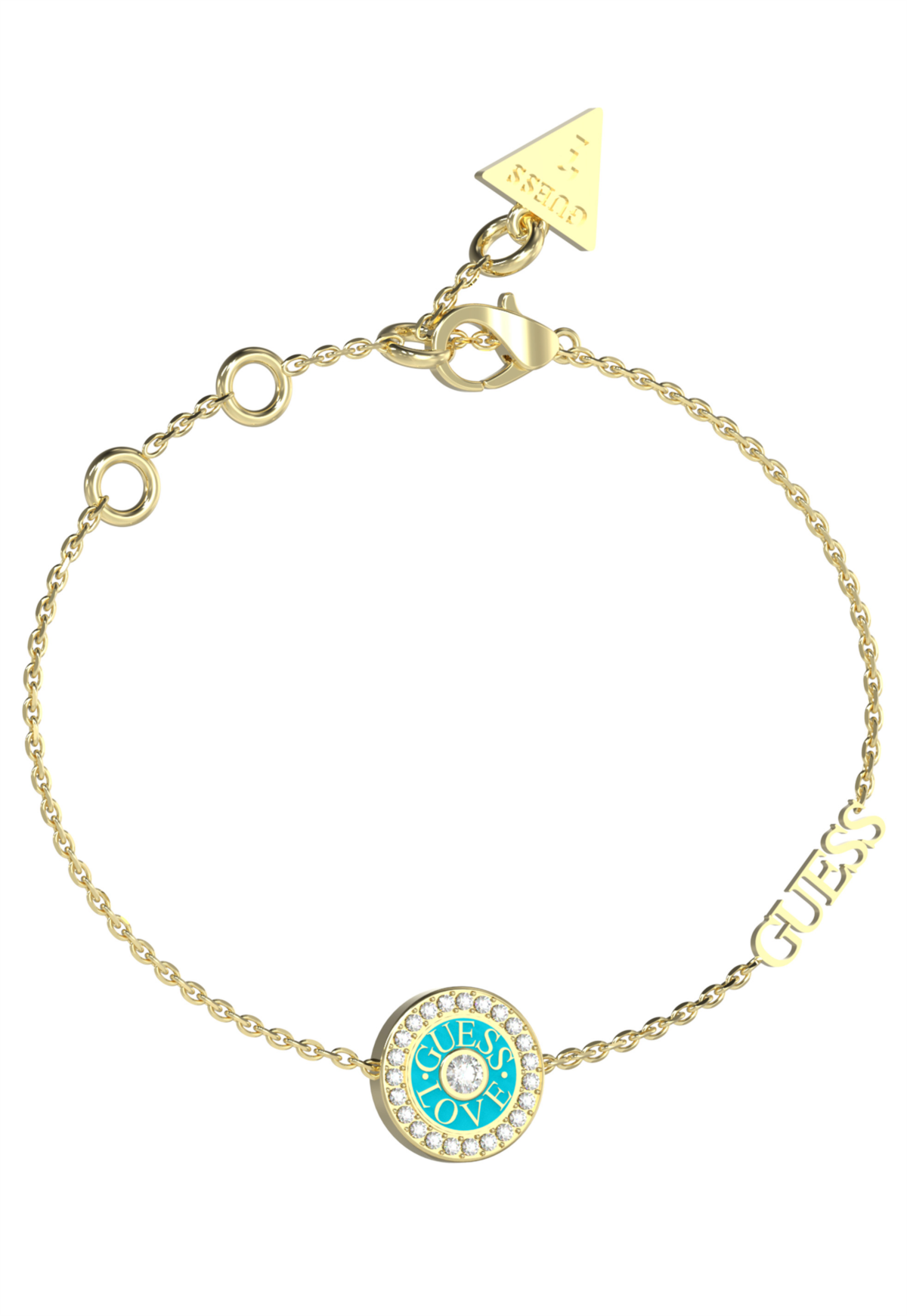 Bracciale donna guess, UBB04082YGTQ, collezione lovely guess, in acciaio dorato con smalto turchese e zirconi