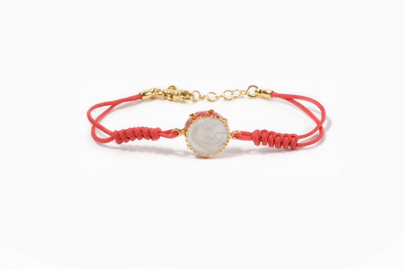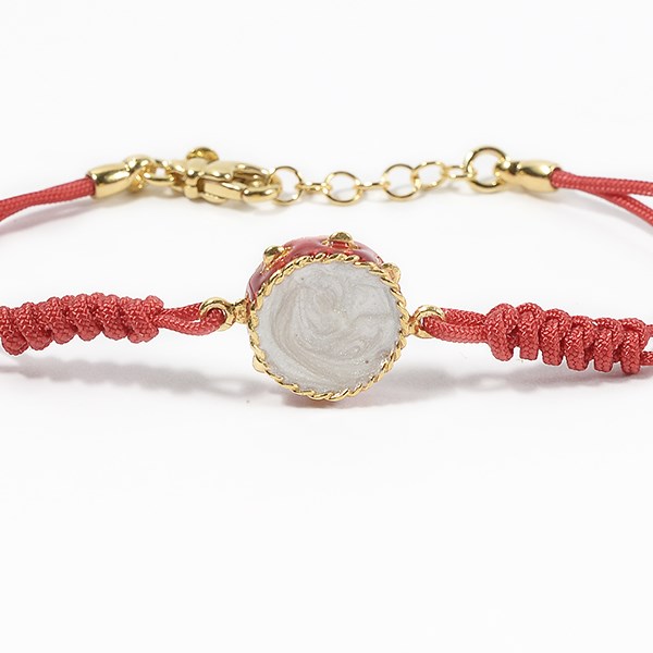 Bracciale in argento 925 placcato oro, smalti e cordino in tessuto annodato a mano anallergico con chiusura estendibile.20000073 Il tamburello è uno strumento musicale a cornice, costituito da una parte in legno di faggio e da una cornice su cui si applica la pelle di capra o di capretto.