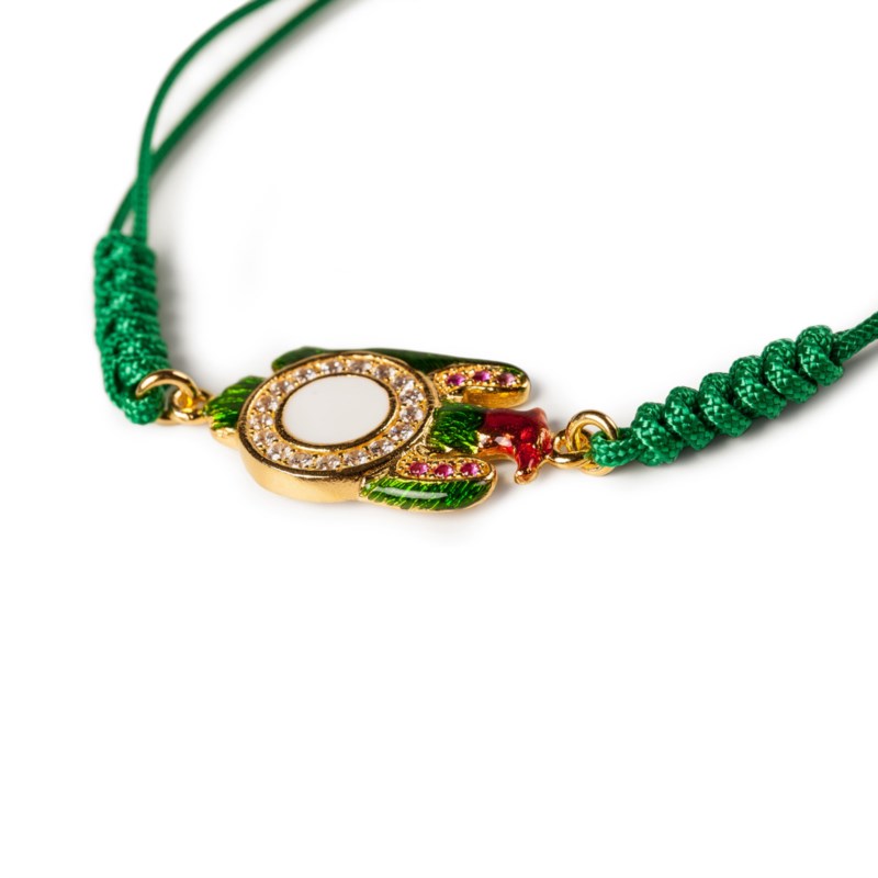 Bracciale in argento 925 placcato oro e smalti con cristalli. Cordino di tessuto anallergico annodato a mano con chiusura estendibile.20000124 Un grande rapace trattiene una moneta d’oro.