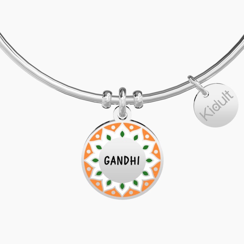Bracciale donna kidult, 731884, collezione gandhi collection, in acciaio, pendente con smalto verde e arancione e pendente con scritta:'be the change you wish to see in the world'