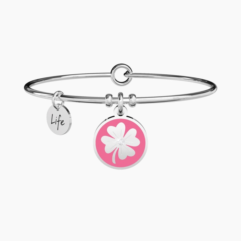 Bracciale donna kidult, 731713, collezione nature, in acciaio, pendente con smalto e quadrifoglio con cristallo centrale e scritta smaltata nera:'Good Luck'