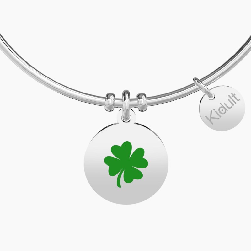 Bracciale donna kidult, 731875, collezione nature, in acciaio, pendente con quadrifoglio verde e pendente con cristalli e scritta smaltata nera:'Buona fortuna'