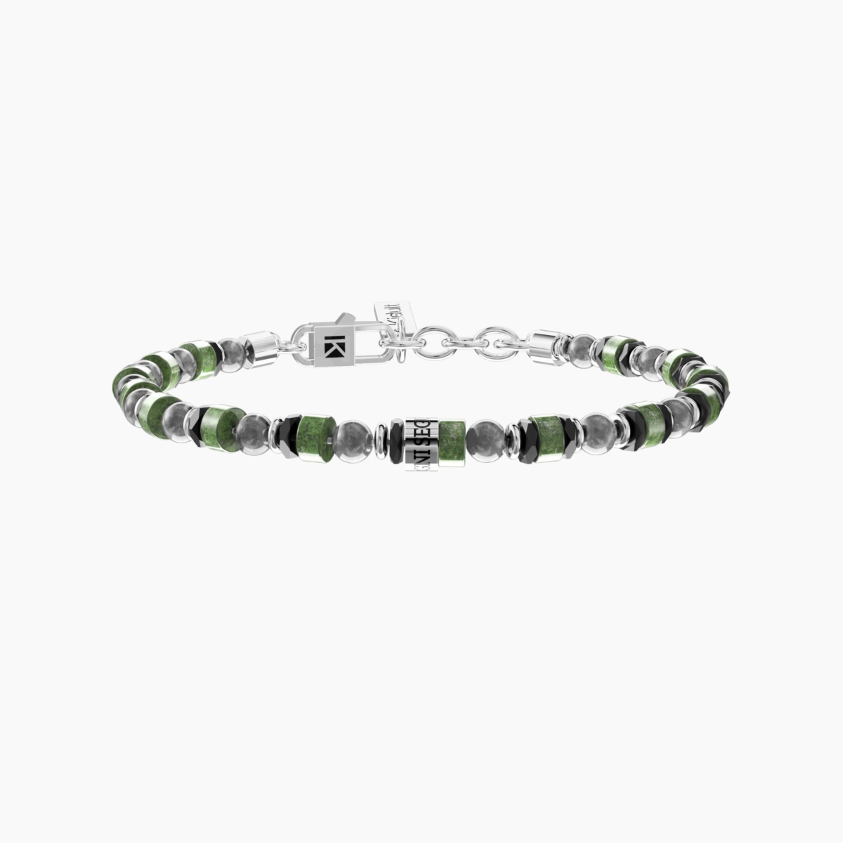 Bracciale uomo kidult, 732298, collezione philosophy, Bracciale uomo regolabile in acciaio con agata grigia striata, turchese verde, ematite faccettata e scritta "Segui i tuoi sogni". • Misura regolabile, lunghezza da 19 a 21 cm • Materiale: Acciaio 316L, Agata grigia, Turchese verde, Ematite • Dimensione delle pietre: 4, 2.5x4.5 e 2x4 mm • Immagine indicativa in quanto trattandosi di pietre naturali i colori del bracciale potrebbero variare