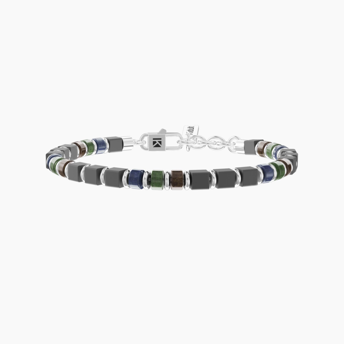 Bracciale uomo kidult, 732299, collezione philosophy, Bracciale uomo regolabile in acciaio con sodalite blu, giada, occhio di tigre ed ematite taglio quadrato. • Misura regolabile, lunghezza da 19 a 21 cm • Materiale: Acciaio 316L, Sodalite blu, Giada, Occhio di tigre, Ematite • Dimensione delle pietre: 2.5x4 e 4x4 mm