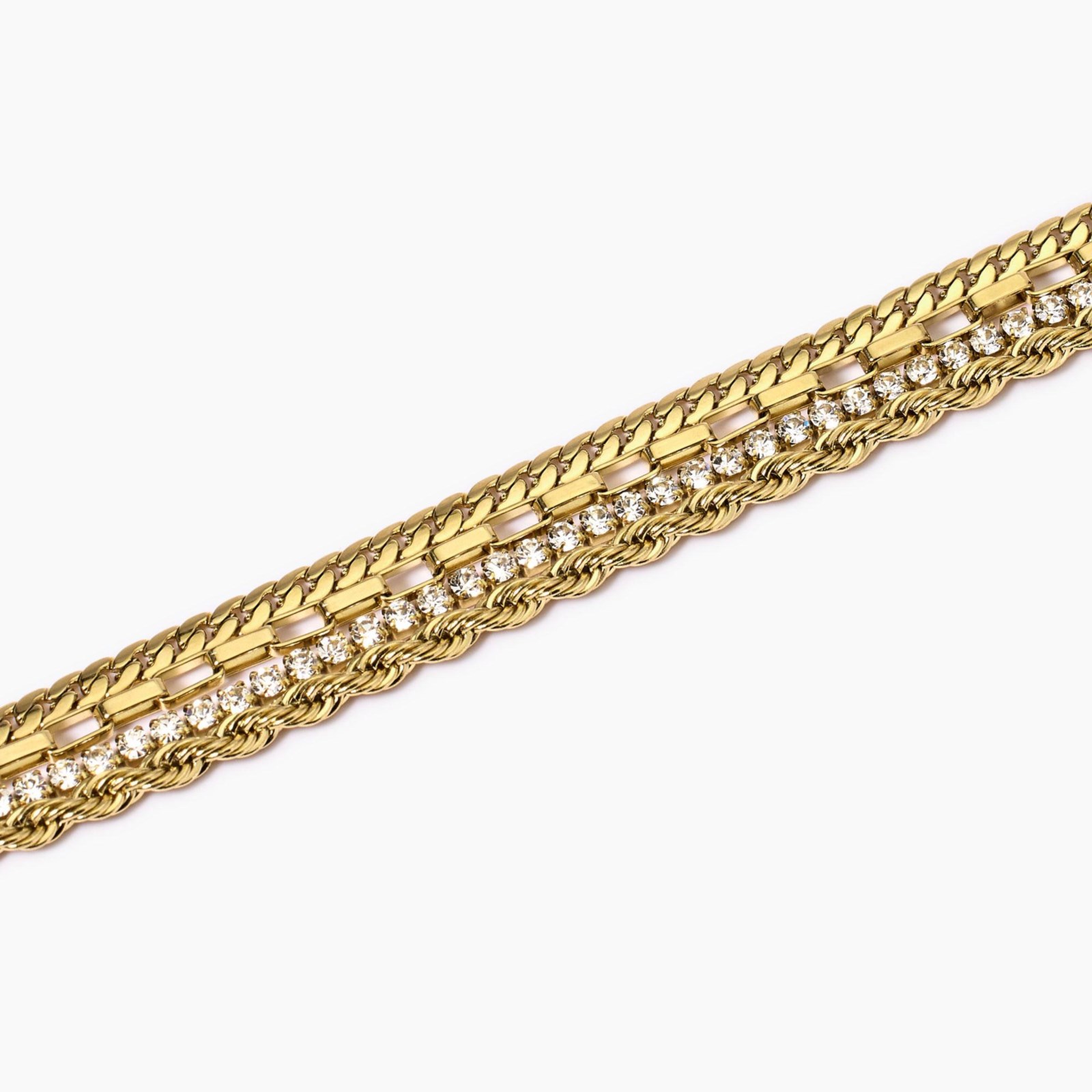 Bracciale donna kidult, 831030, collezione style, regolabile in acciaio dorato con tre catene e tennis di cristalli bianchi. • Dimensione catena corda: 4 mm • Dimensione catena groumette: 3 mm • Dimensione catena allungata: 2, 5 mm • Diametro cristalli: 2 mm • Misura regolabile, lunghezza da 16 a 19 cm