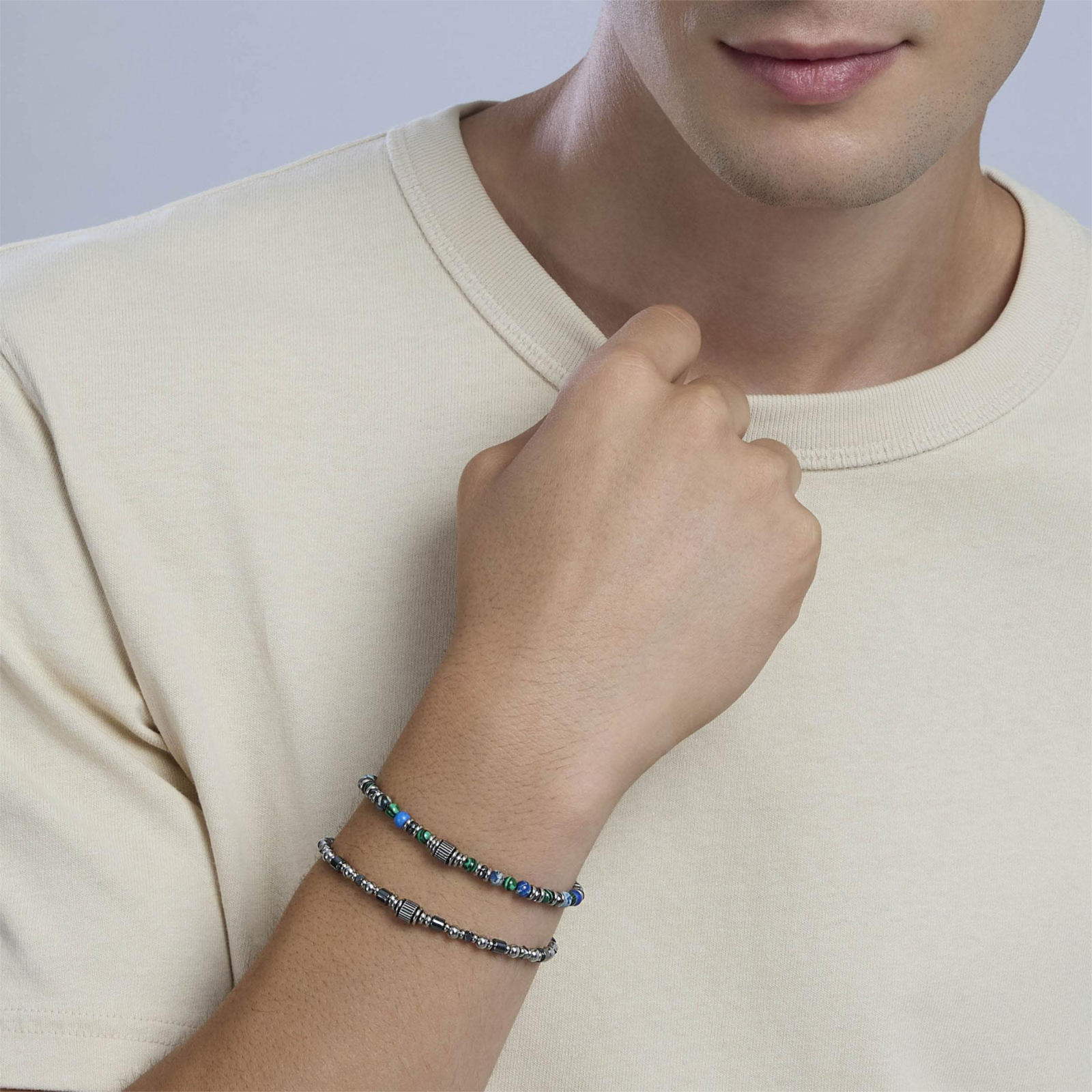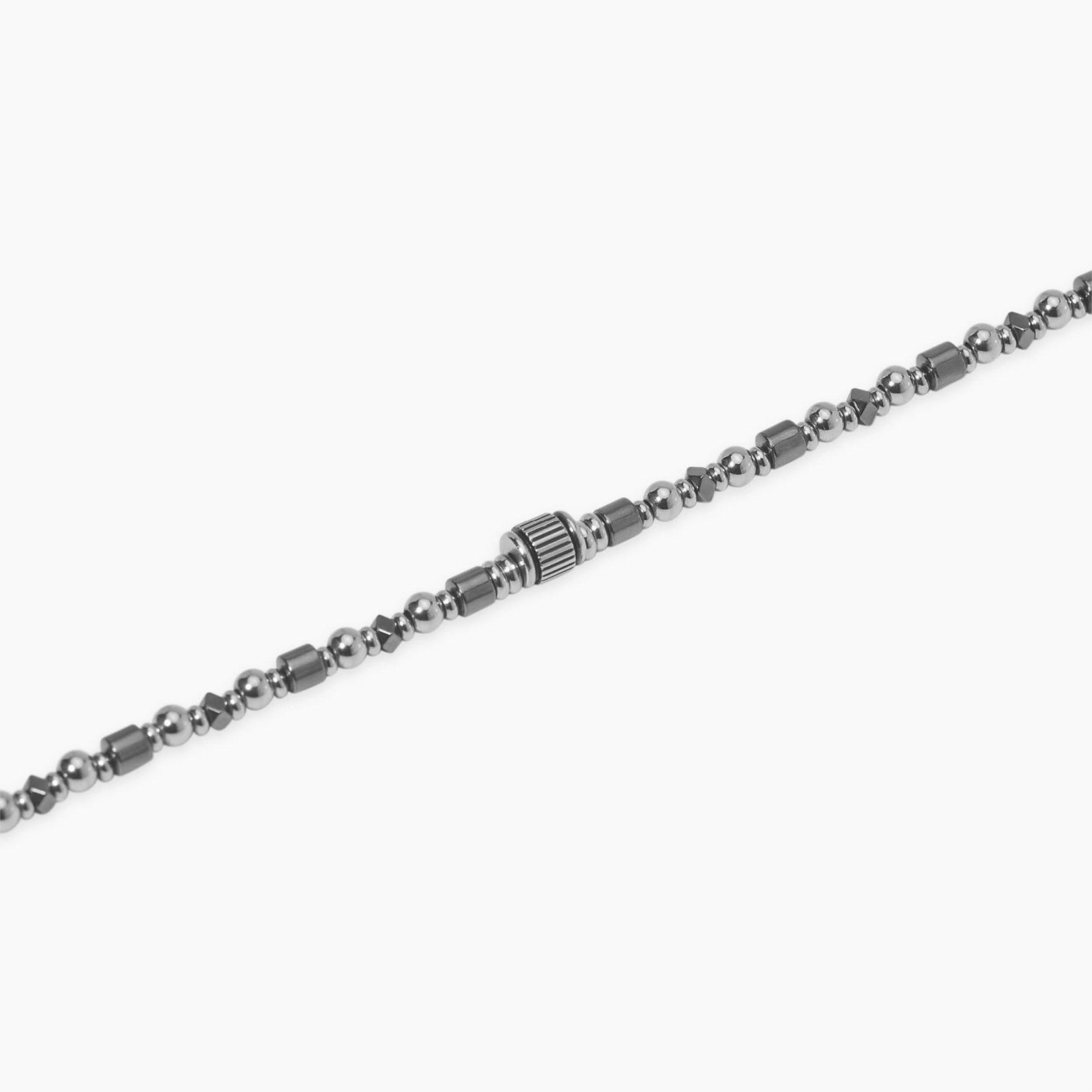 Bracciale uomo kidult, 831129, collezione style, in acciaio con con elemento centrale a strisce, cilindri e cubetti faccettati in ematite. • Dimensione elemento: 6, 6x6 mm • Diametro cilindri: 3, 7 mm • Dimensione ematite: Ø4 e 2, 7x2, 7 mm • Misura regolabile, lunghezza da 19 a 21 cm