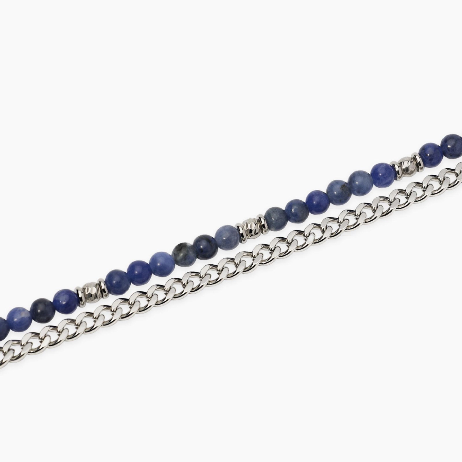 Bracciale uomo kidult, 831156, collezione style, in acciaio con catena groumette e catena di sfere diamantate e sfere in sodalite blu. • Dimensione catena: 4, 5 mm • Diametro sfere: 4 mm • Diametro pietre: 4 mm • Misura regolabile, lunghezza da 19 a 21 cm
