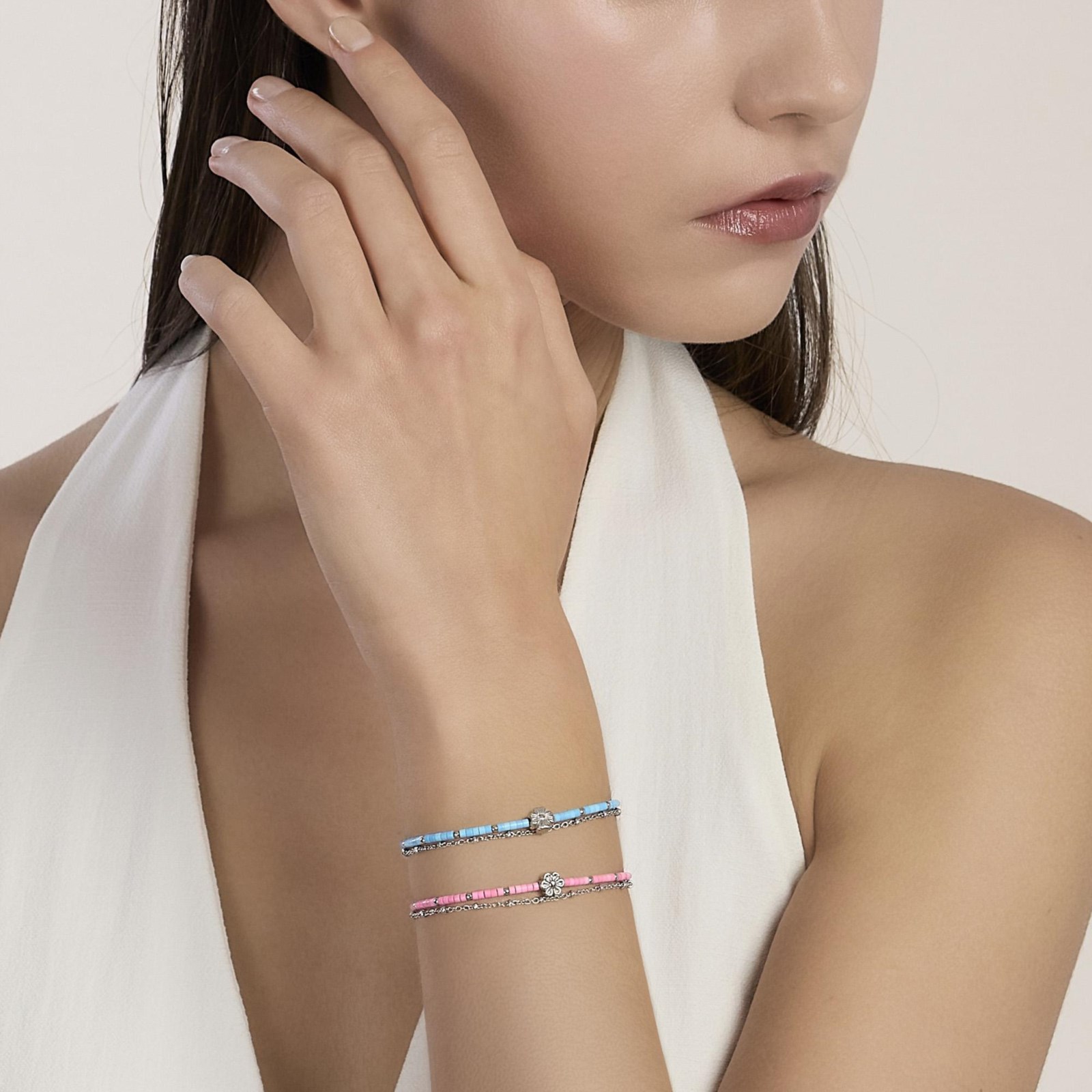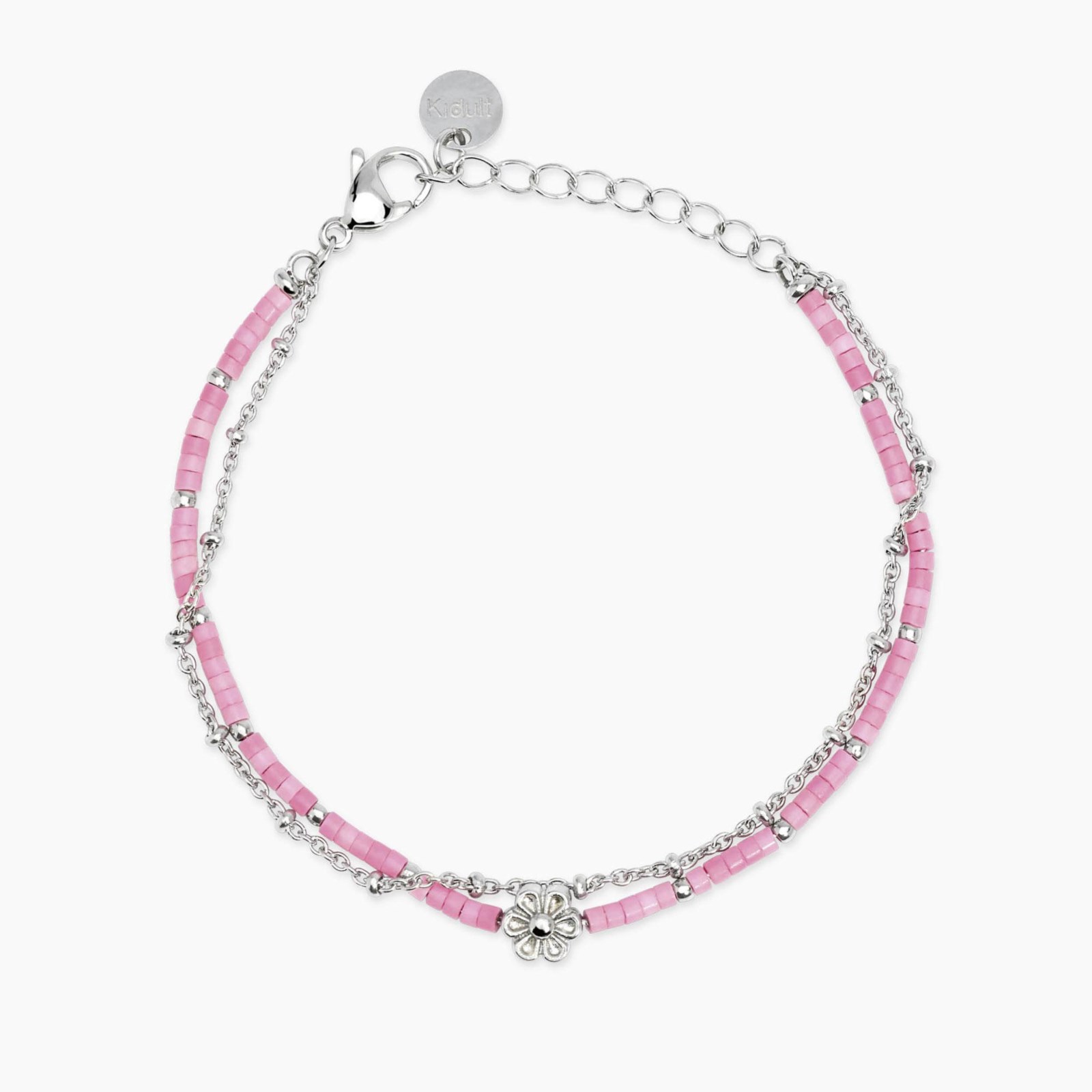 Bracciale donna kidult, 831232, collezione style, in acciaio e catena con cilindri in turchese tinto rosa con elemento fiore centrale.