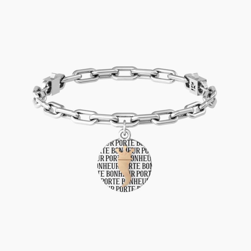 Bracciale donna kidult, 731969, collezione symbols, in acciaio/acciaio rosato, ciondolo con cornetto e scritta: "bonheur porte", lunghezza 19cm regolabile