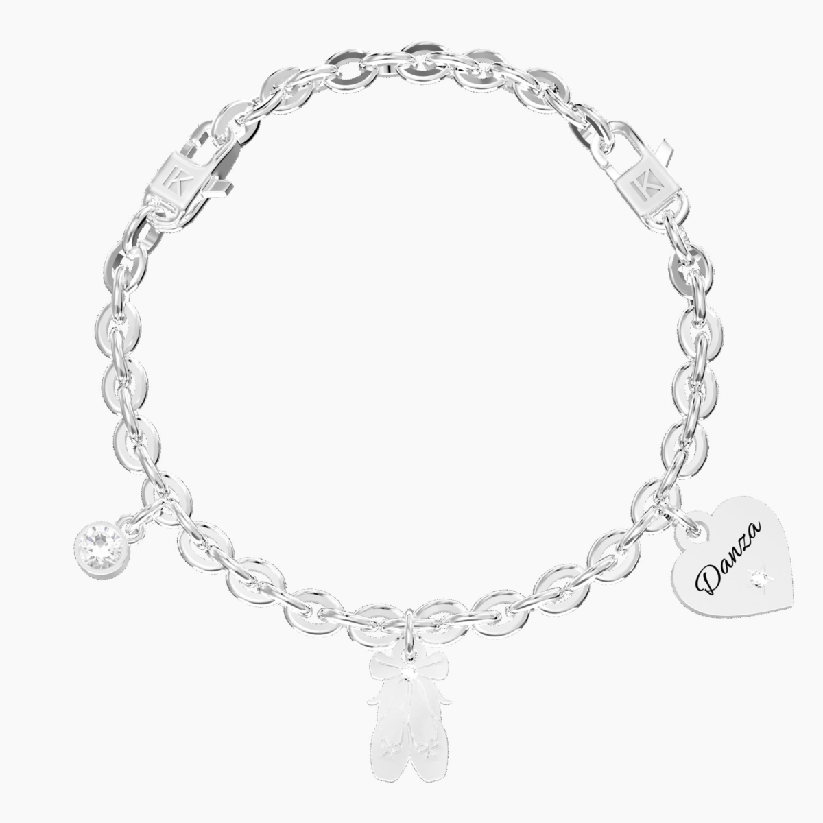 Bracciale donna kidult, 732284, collezione symbols, Bracciale regolabile Comfort Fit in acciaio con catena forzatina e ciondoli a forma di scarpette da ballo e cuore con scritta "Danza", con cristalli . • Il sistema "comfort fit" permette facilmente di adattare in modo confortevole ed elegante il bracciale al tuo polso.