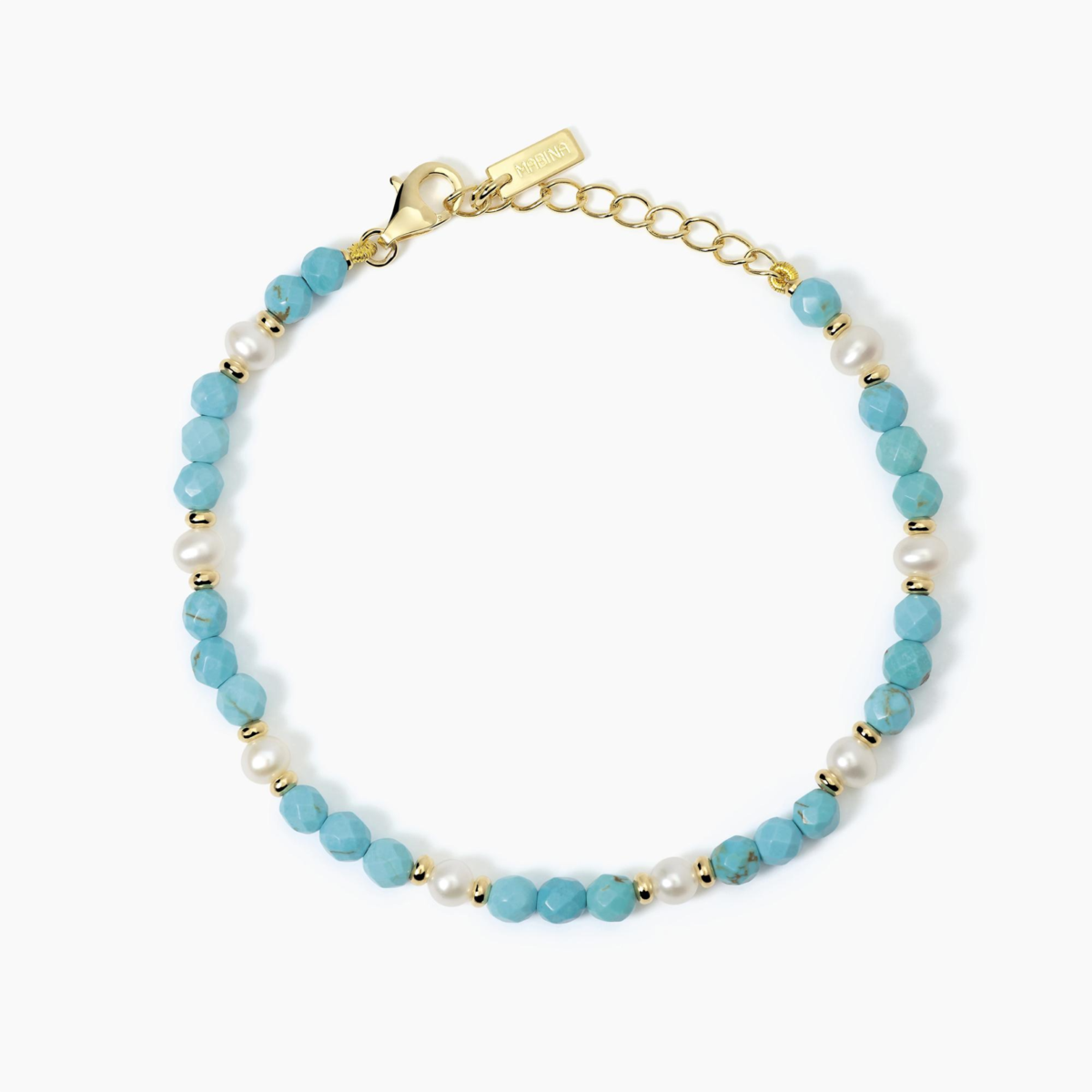 Bracciale donna mabina, 533747, collezione argento donna, Bracciale da donna in argento placcato oro 18k, perle coltivate e turchese. • Diametro turchese: 4 mm • Diametro perle coltivate: 3, 5 - 4 mm • Chiusura con moschettone • Misura regolabile, lunghezza da 16 a 19 cm • Materiale: Argento 925, Turchese, Perle coltivate • Finitura: Placcatura in oro 18k