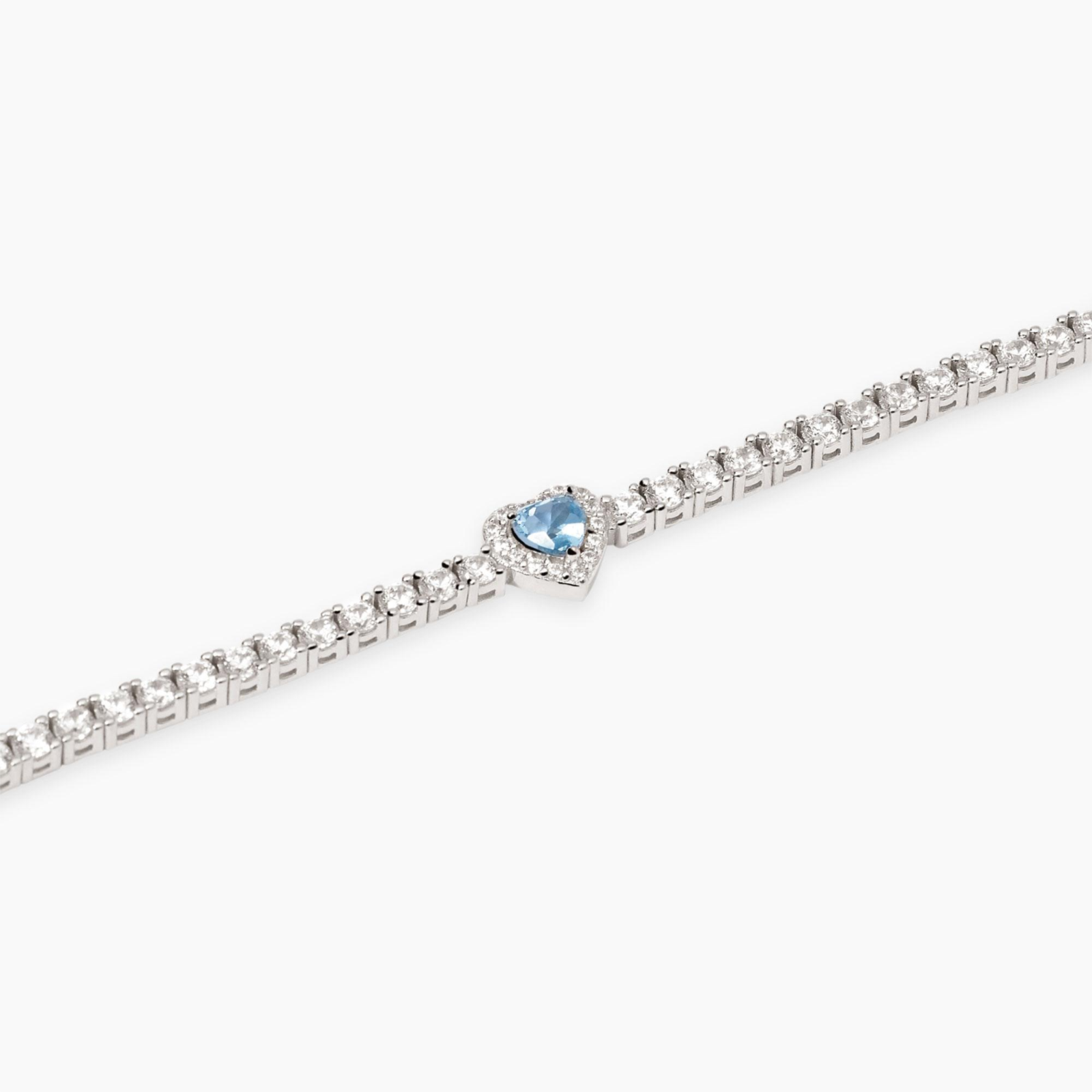 Bracciale donna mabina, 534107-18, collezione argento donna, tennis in argento rodiato con zirconi bianchi e acquamarina sintetica taglio cuore. • Dimensione cuore: 4x4 mm • Diametro zirconi: 1 e 2 mm • Misura unica, lunghezza 18 cm