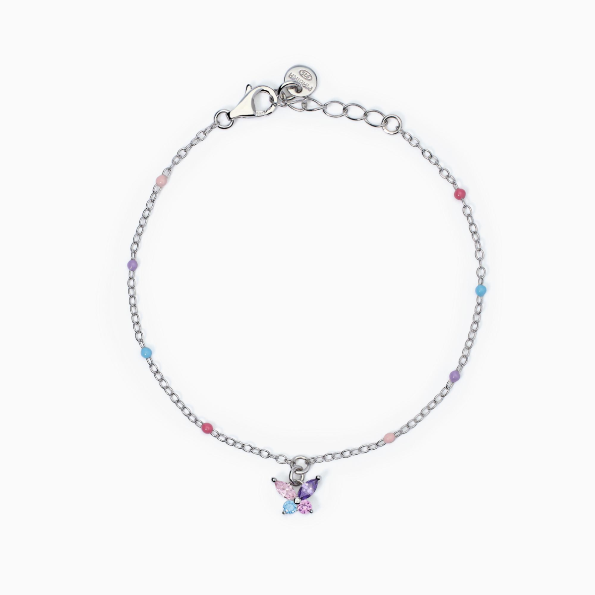 Bracciale bimba mabina, 533872, collezione argento junior, in argento rodiato con catena forzatina, applicazioni smaltate e ciondolo a forma di farfalla in tormalina sintetica rosa e zirconi multicolor taglio a navette. • Dimensione ciondolo farfalla: 7 x 6 • Chiusura con moschettone • Misura regolabile, lunghezza da 14.5 a 16.5 cm