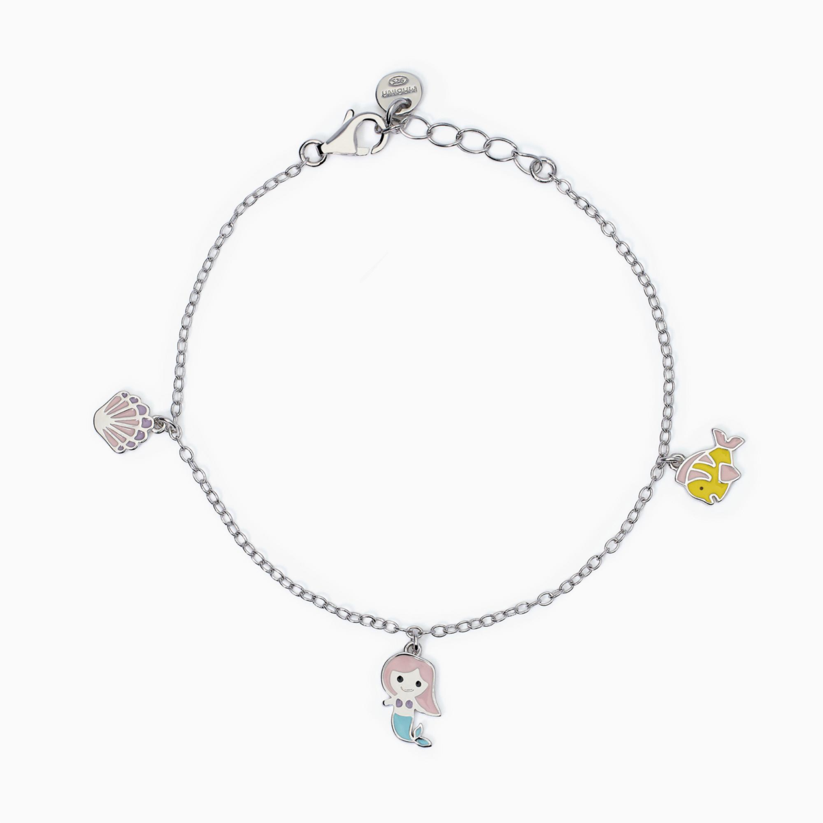 Bracciale donna mabina, 533873, collezione argento junior, regolabile in argento rodiato con catena forzatina e ciondoli smaltati a forma di conchiglia, sirenetta e pesciolino. • Dimensione ciondolo conchiglia: 6.5 x 6.5 • Dimensione ciondolo sirenetta: 6.5 x 9.5 • Dimensione ciondolo pesciolino: 8 x 6.5 • Chiusura con moschettone • Misura regolabile, lunghezza da 14.5 a 16.5 cm • Materiale: Argento 925, Smalto