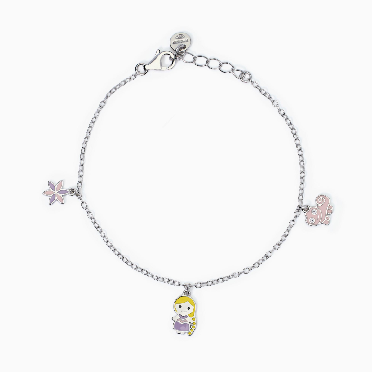 Bracciale donna mabina, 533874, collezione argento junior, in argento rodiato con catena forzatina e ciondoli smaltati a forma di fiorellino, Raperonzolo e animaletto. • Dimensione ciondoli fiorellino: 5.5 x 6.5 • Dimensione ciondolo raperonzolo: 7.5 x 9 • Dimensione ciondolo animaletto: 7.5 x 6 • Chiusura con moschettone • Misura regolabile, lunghezza da 14.5 a 16.5 cm • Materiale: Argento 925, Smalto