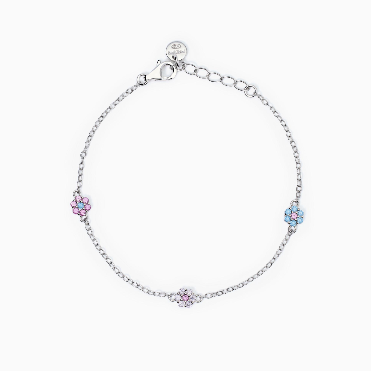 Bracciale bimba mabina, 533876, collezione argento junior, in argento rodiato con catena forzatina, tormalina rosa sintetica e zirconi multicolor. • Diametro tormaline sintetiche e zirconi: 1.5 mm • Chiusura con moschettone • Misura regolabile, lunghezza da 14.5 a 16.5 cm