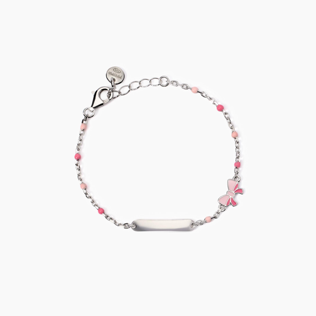 Bracciale bimba mabina, 533926, collezione argento junior, in argento rodiato con catena forzatina, inserti smaltati e targhetta centrale incidibile e fiocchetto smaltato. • Piastra in argento ideale per incisioni • Dimensione della piastra: 17 x 3, 5 mm • Dimensione fiocco: 7, 5 x 5, 5 mm • Chiusura con moschettone • Misura regolabile, lunghezza da 12 a 14 cm